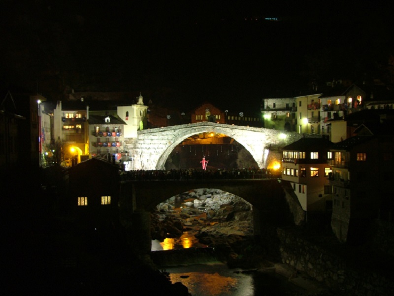 San Martino (the Bishop) and his adversary Satan, then the Roman Consul, the Tribunes of the People, the Roman Guards and their Officer and, lastly, the Lily Nymph accompanied by her two Maids are the leading characters in the historical carnival in Pont-Saint-Martin. A key feature of the carnival is the chariot race: each district or “insula” in the town has its own chariot and team consisting of a charioteer and a number of athletic youngsters, whose job it is to pull the chariot. Tuesday is a day when the carnival parade is held with floats from Point-Saint-Martin, some nearby villages and towns in Piedmont and Val d’Aosta. The day comes to a close beneath the span of the old Roman bridge, with the burning of Diavolo Satana (Satan) and a spectacular firework display.