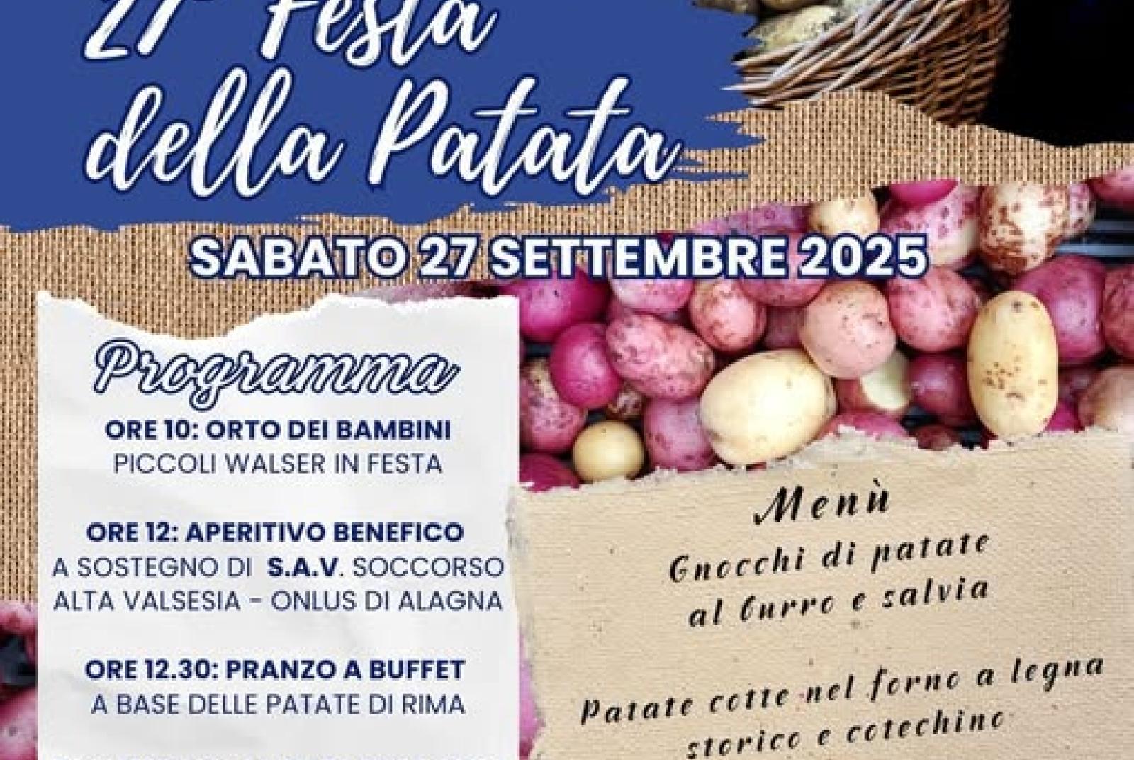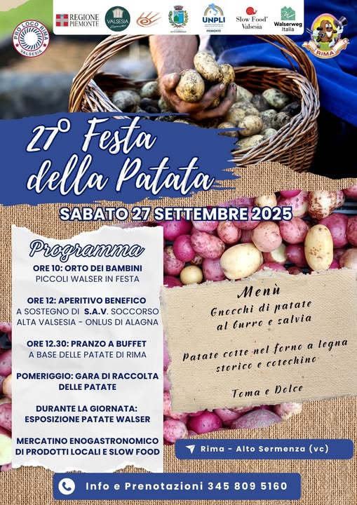 Sabato 27 settembre a Rima 27^ festa della patata: vendita prodotti alimentari d'alpeggio e del territorio. Aperitivo benefico, dalle 12.30 pranzo a buffet in piazza con degustazione di piatti tipici a base di patata. A seguire, tradizionale gara di raccolta delle patate coltivate nei campi del paese.