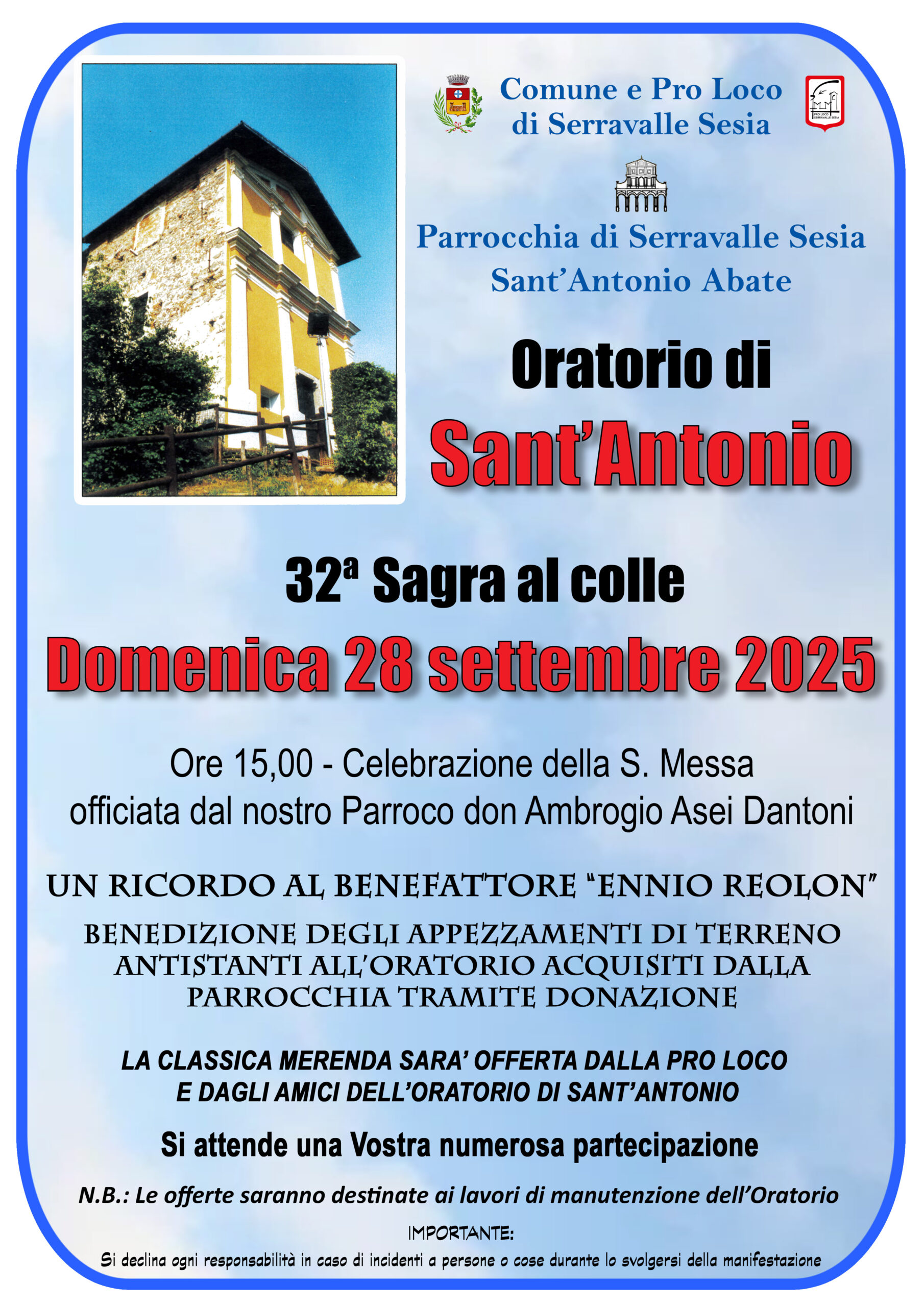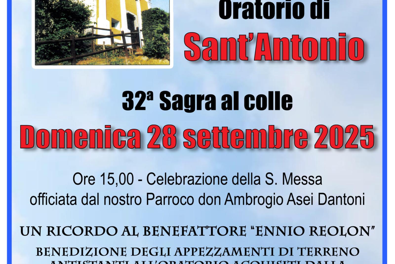 32 Sagra al Colle. Ore 15 Santa Messa. Un ricordo al benefattore Ennio Reolon benedeizione degli appezzamenti di terreno. La merenda sarà offerta dalla pro loco e dagli amici di Sant'Antonio.