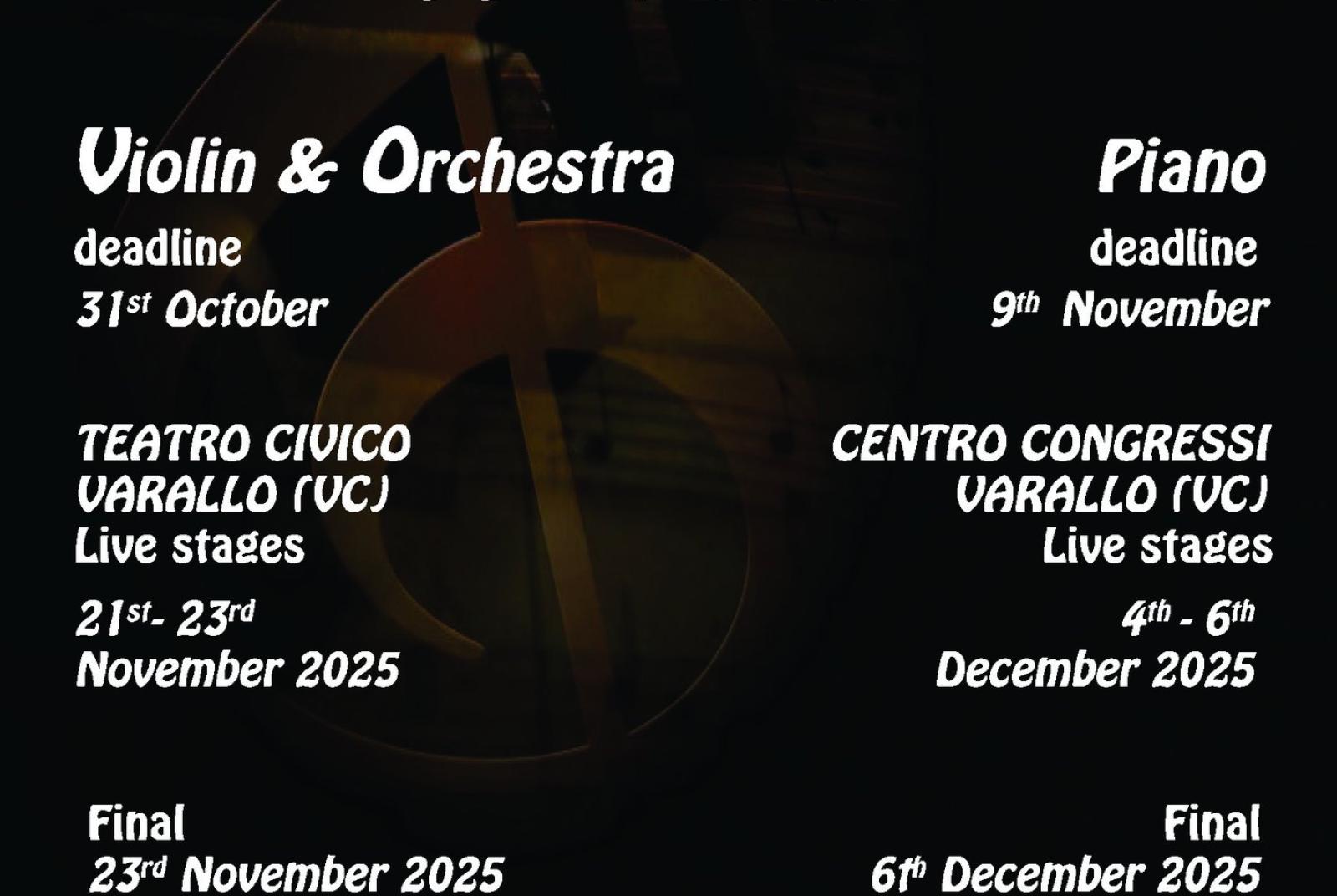 Teatro Civico -Varallo 21-23 Novembre. Venerdì 21 Novembre 2025 Prove a porte chiuse dei semifinalisti con i pianisti accompagnatori Sabato 22 Novembre 2025 (orari da definire) Semifinale Domenica 23 Novembre 2025 ore 20:30 Finale con l’orchestra “Antonio Vivaldi” diretta dal m° Ernesto Colombo