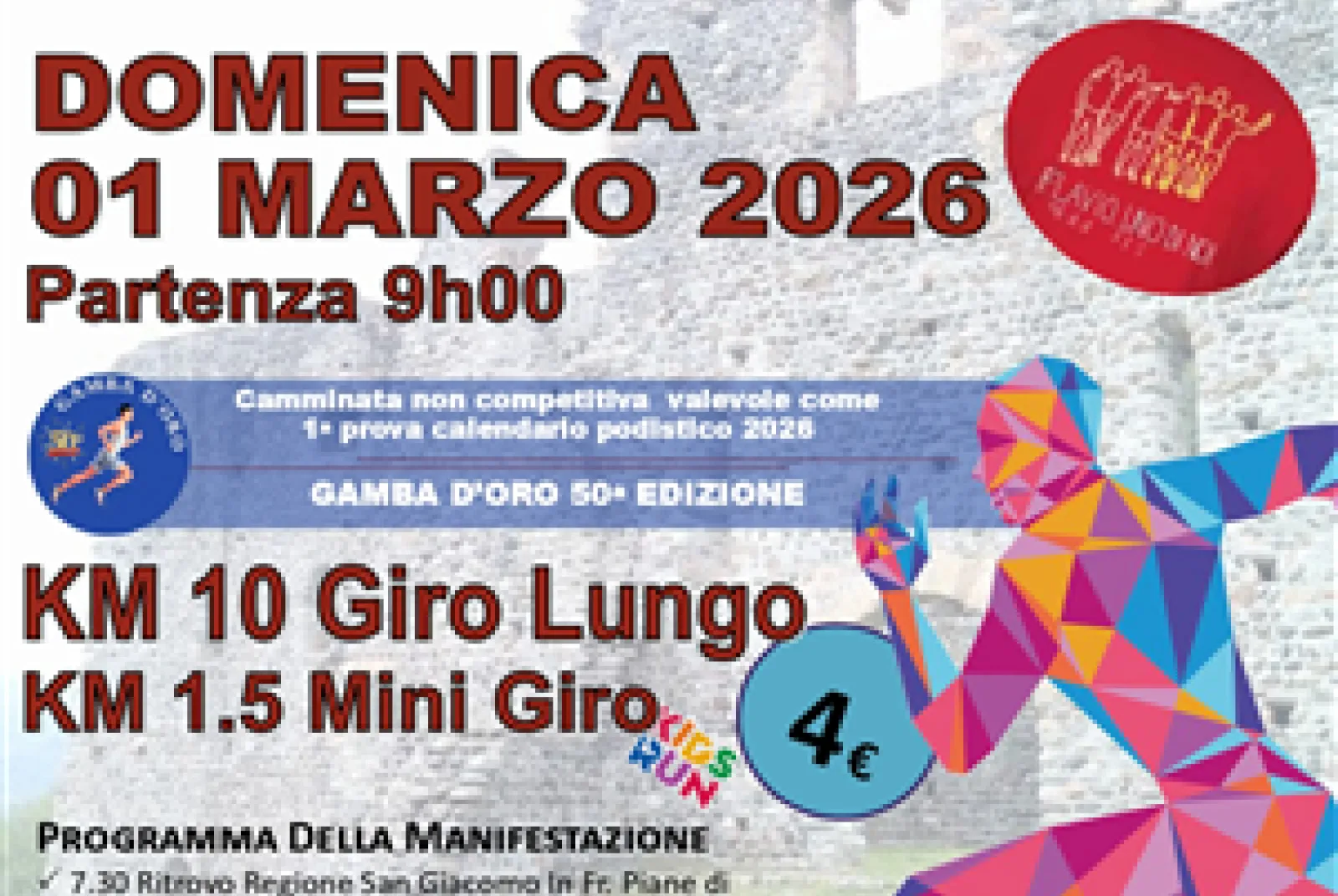 Domenica 1 marzo 4°Memorail Flavio Manfron a Serravalle in Fraz. Piane. Camminata non competitiva valevole come prima prova calendario podistico 2026 - Gamba d’Oro Cinquantesima Edizione. Giro Lungo 10 km e Mini Giro 1,5 km con partenza ore 9.