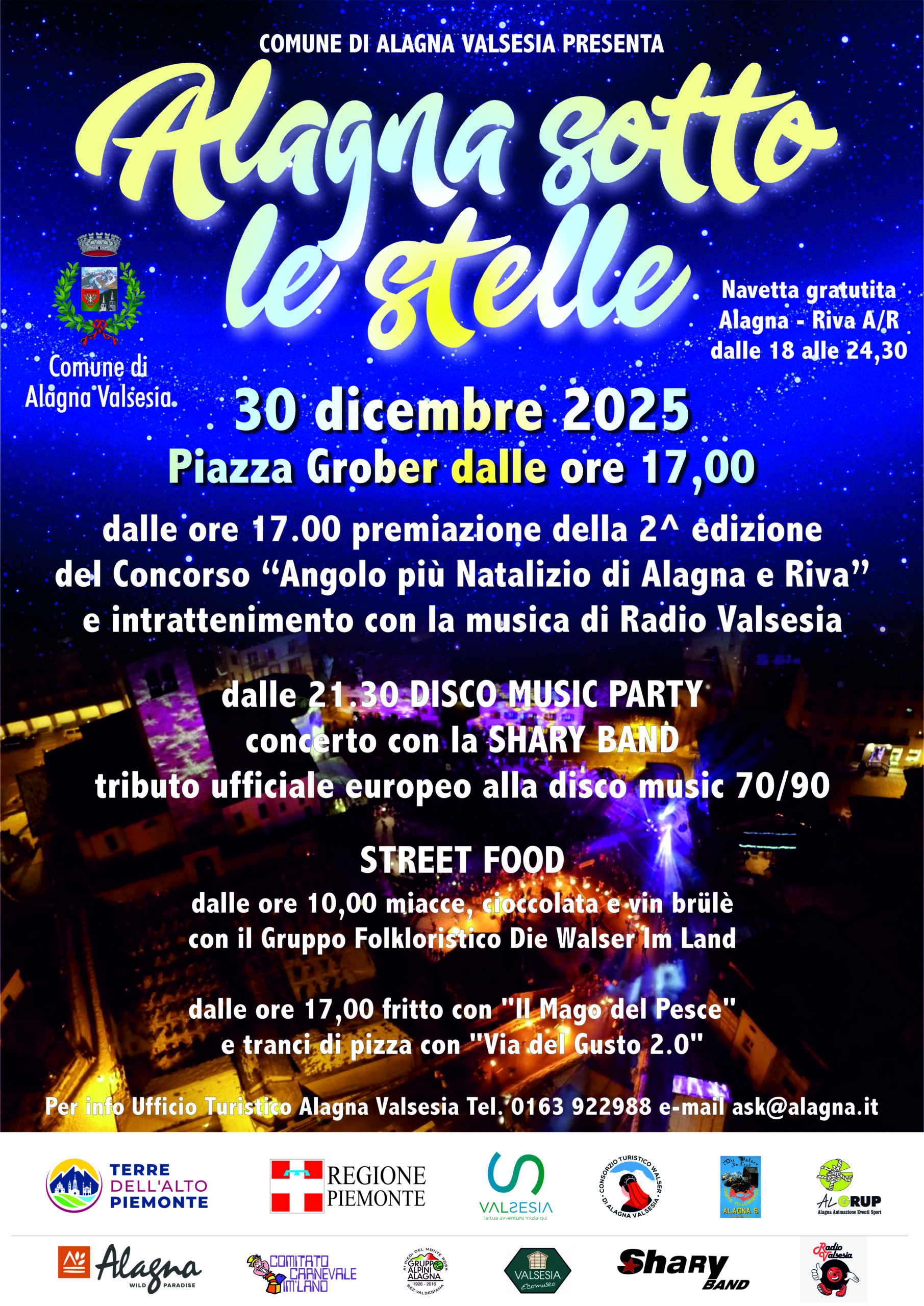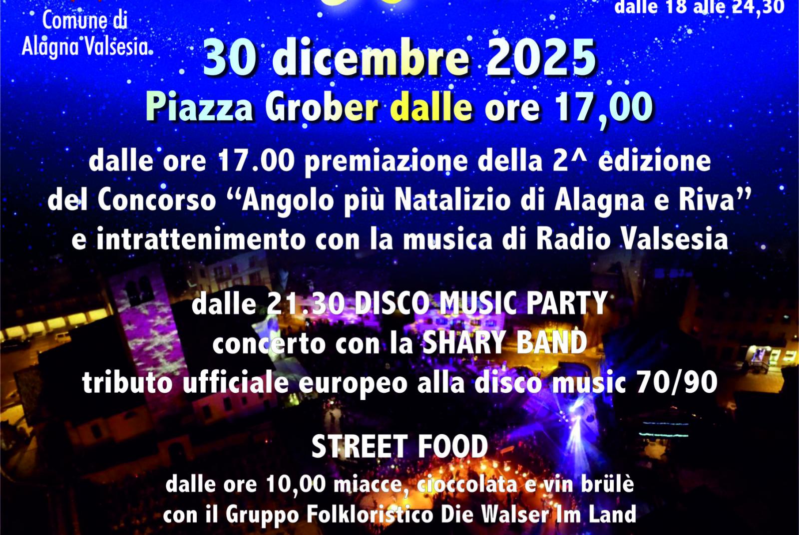 Il 30 dicembre in Piazza Grober ad Alagna, dalle ore 17.00 premiazione della 2a edizione del concorso "Angolo pià natalizio di Alagna e Riva" e intrattenimento con la musica di Radio Valsesia. Dalle ore 21.30 disco music party con Shary Band. Per l'occasione ci sarà la navetta gratuita Alagna-Riva a/r dalle 18.00 alle 00.30.