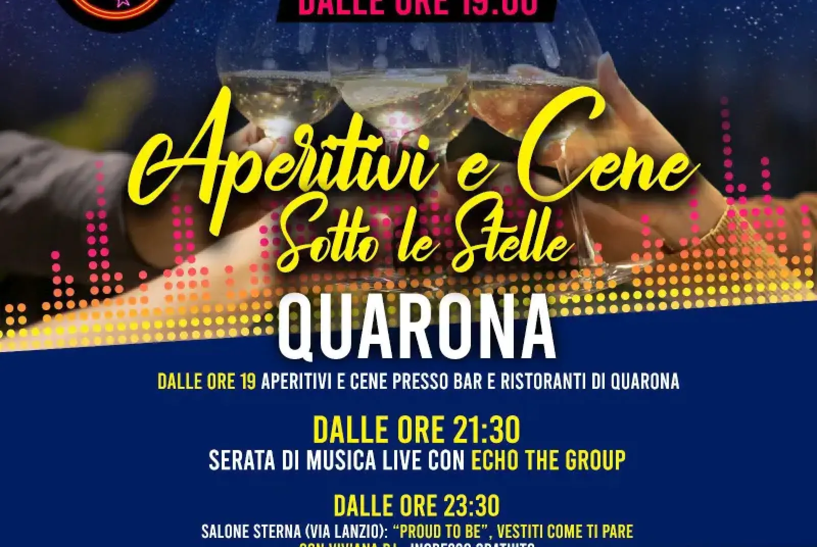 Sabato 5 luglio a Quarona tornano le magiche serate estive con aperitivi e cene sotto le stelle! Dalle ore 19.00 aperitivi e cene presso bar e ristoranti della zona e dalle ore 21.30 musica live a cura degli Echo The group e dalle ore 23.30 presso il Salone Sterna "Proud to be" Vestiti come ti pare con Viviana Dj. Ingresso gratuito.