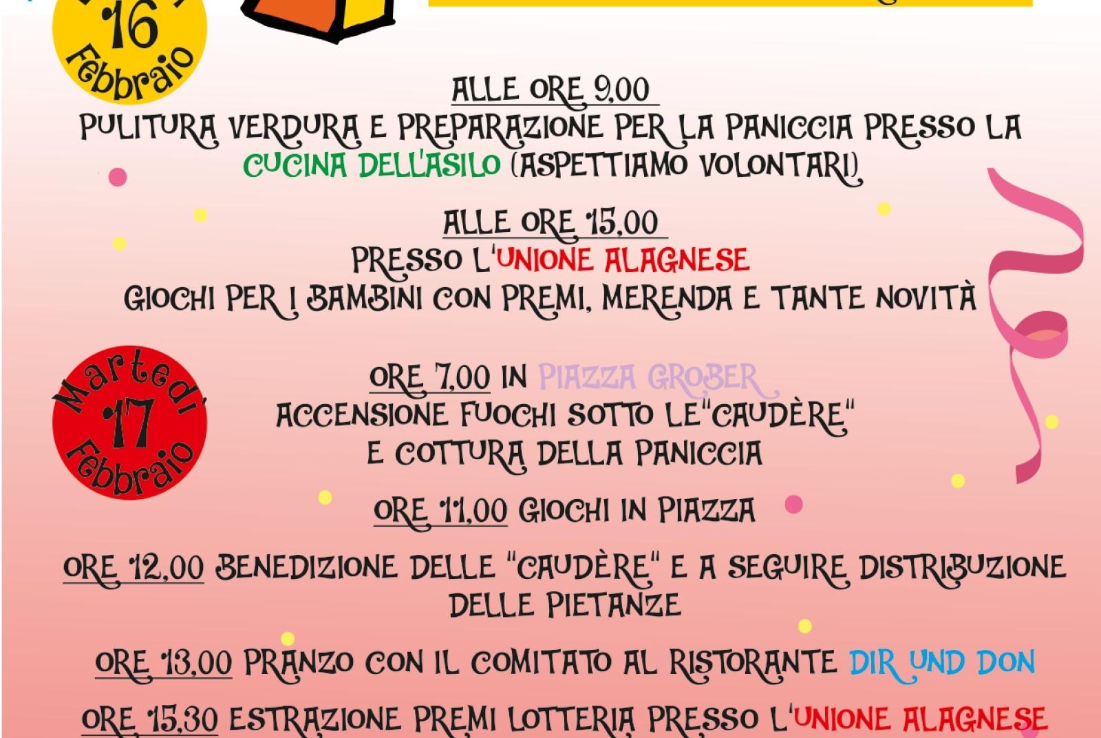 Lunedì 16 febbraio alle ore 9.00 pulitura delle verdure e preparazione della paniccia, presso la cucina dell'asilo e alle ore 15.00 presso l'Unione Alagnese giochi per bambini con premi, merenda e tante novità. Martedì 17 febbraio paniccia in piazza Grober ad Alagna. La distribuzione sarà dalle ore 12 (h13.00 pranzo e h20.30 cena presso Dir Und Don). Prenotazioni Nel pomeriggio lotteria presso il Teatro Unione Alagnese. A seguire alle h21.30 veglia danzante presso l'Unione Alagnese
