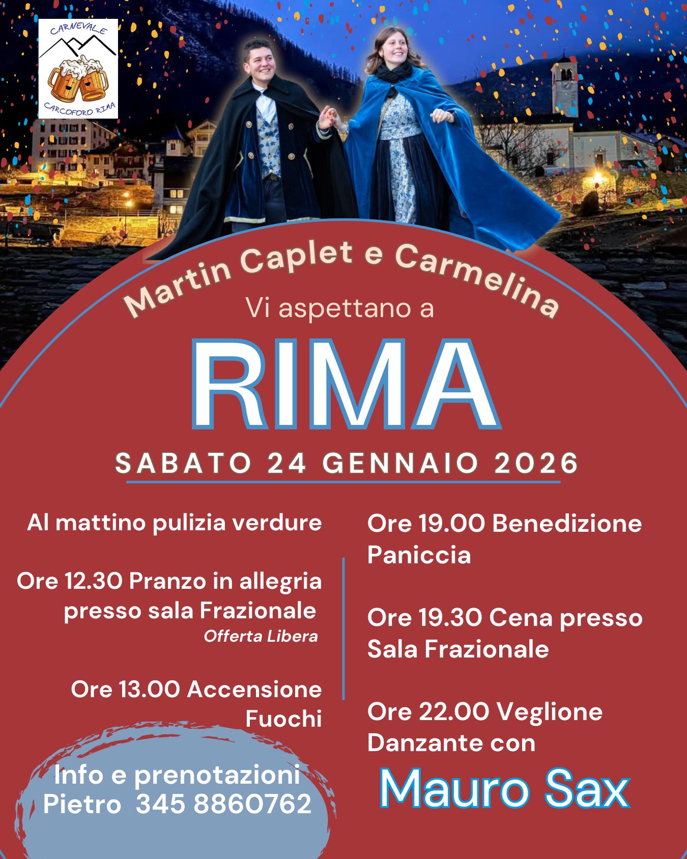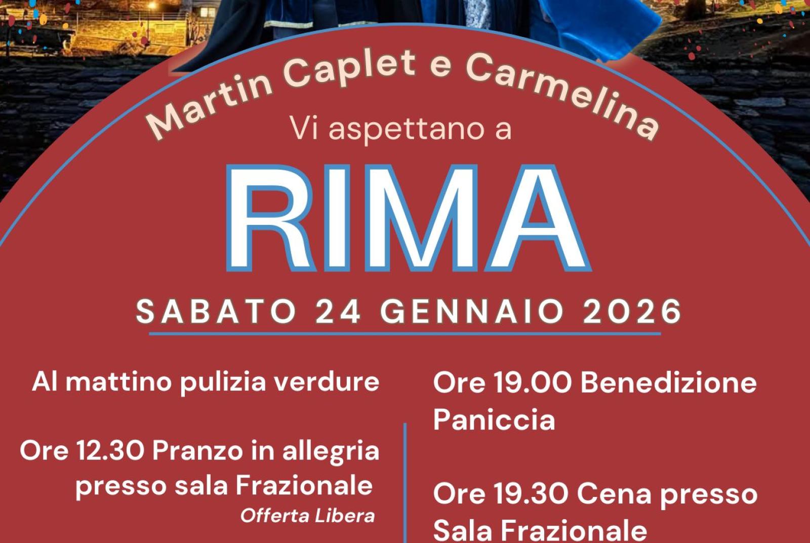 Sabato 24 gennaio Martin Caplet e Carmelina vi aspettano a Rima! Come da tradizione, la giornata inizia al mattino con la preparazione delle verdure, poi si pranza tutti insieme in allegria. Nel pomeriggio si accendono i fuochi e, alle 19.00, arriva il momento più atteso: la benedizione della Paniccia, pronta per essere condivisa. La serata continua con la cena alla Sala Frazionale e il veglione danzante con Mauro Sax