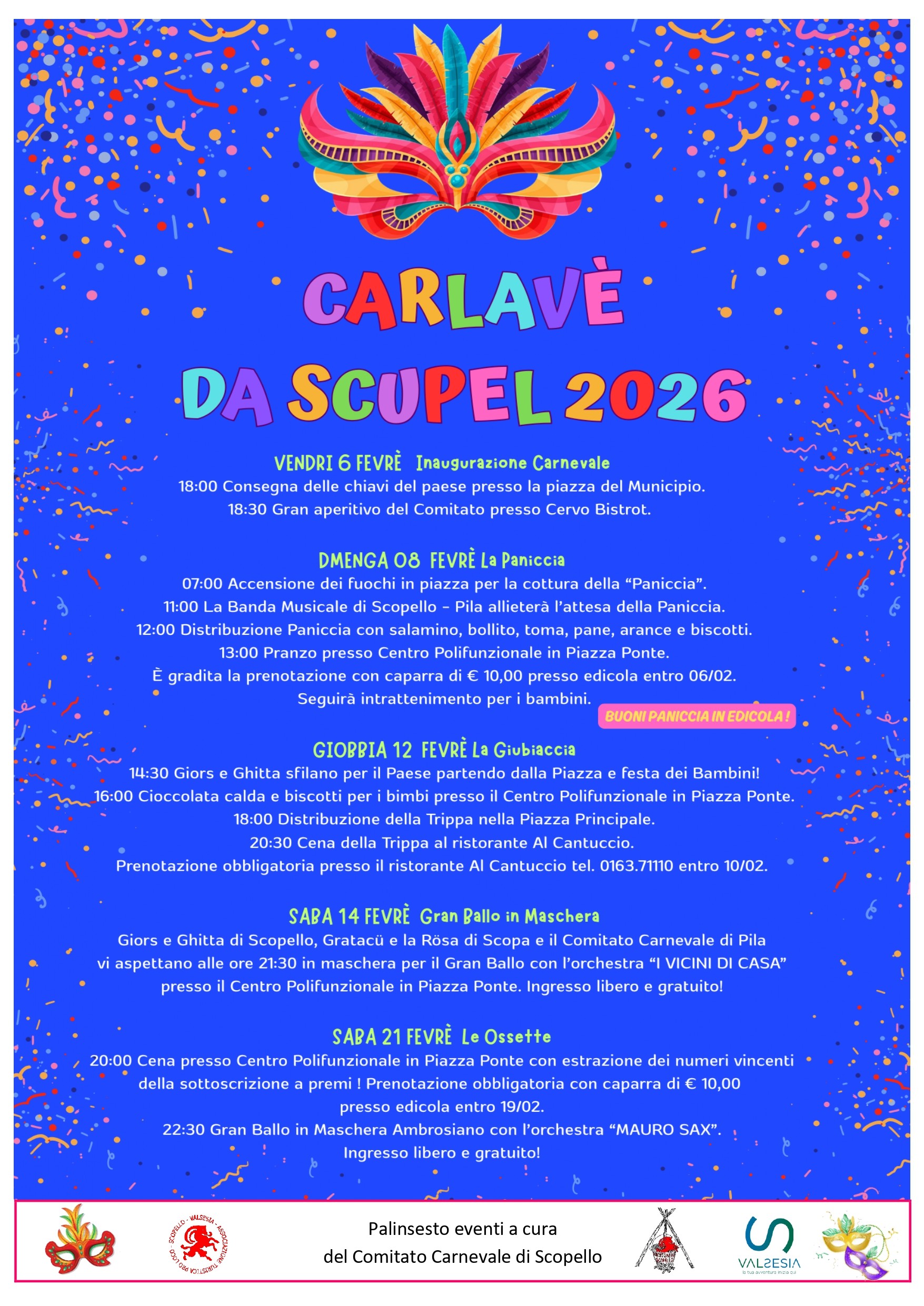 Inaugurazione Carnevale ore 18.00 presentazione maschere e consegna delle chiavi presso la Piazza del Municipio. Ore 18.30 gran aperitivo del Comitato presso Cervo Bristrot.