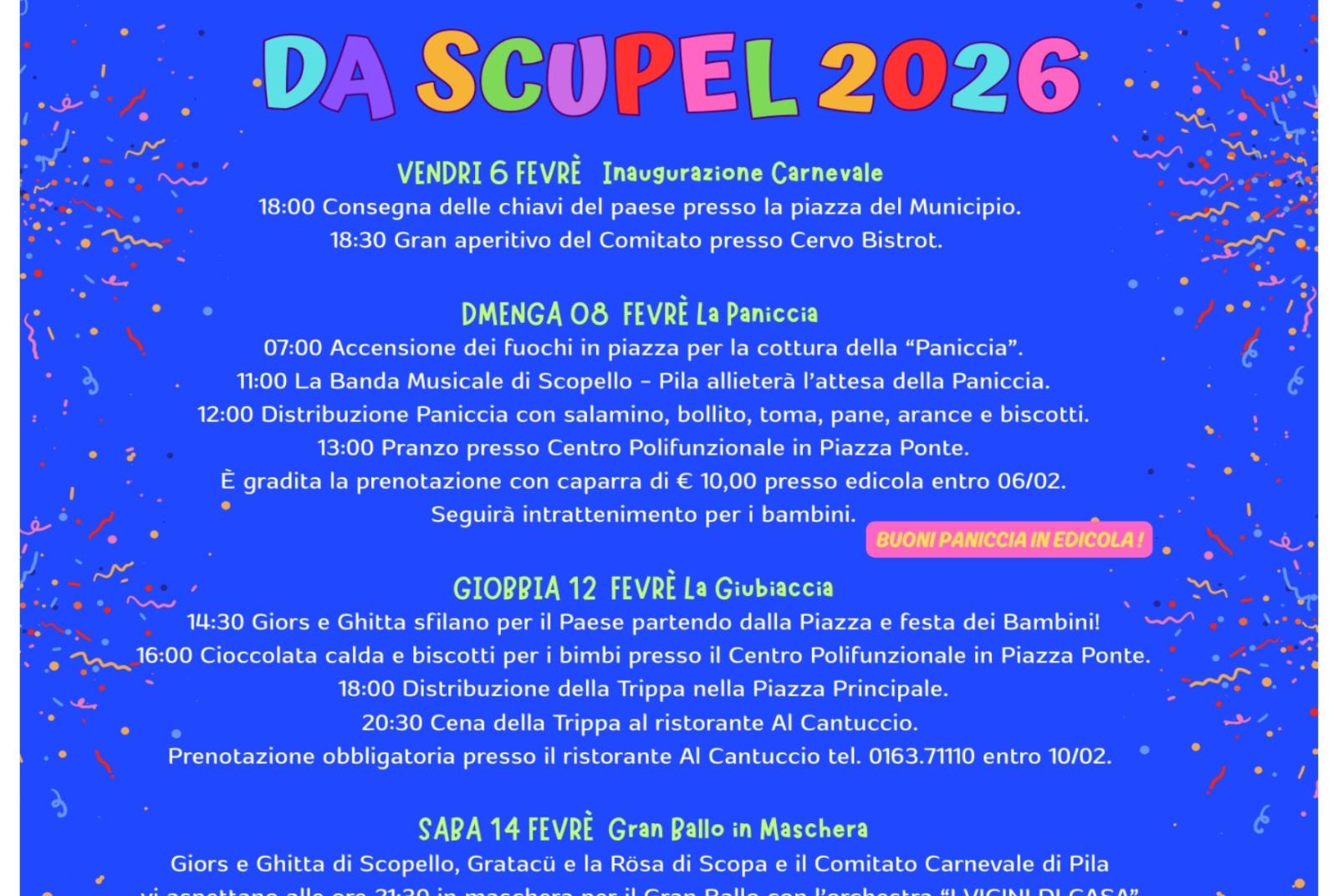Alle 07.00 accensione dei fuochi in piazza per la cottura della Paniccia. Dalle ore 11.00 la Banda Musicale di Scopello e Pila allieterà l'attesa della distribuzione della paniccia. Dalle 12.00 si inizierà la distribuzione della paniccia con: salamino, bollito, fetta di toma, pane, arance e biscotti. I buoni paniccia sono in vendita presso l'edicola e domenica mattina anche presso la casetta degli alpini. Alle 13.00 presso il Centro Polifunzionale, il Comitato Carnevale organizza il pranzo e vi aspetta numerosi. E' gradita la prenotazione con caparra di € 10,00 presso edicola entro il 06 febbraio.