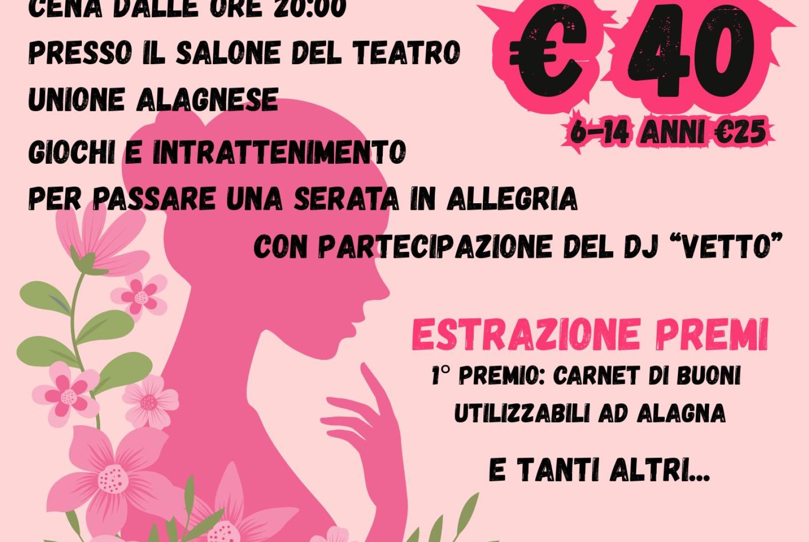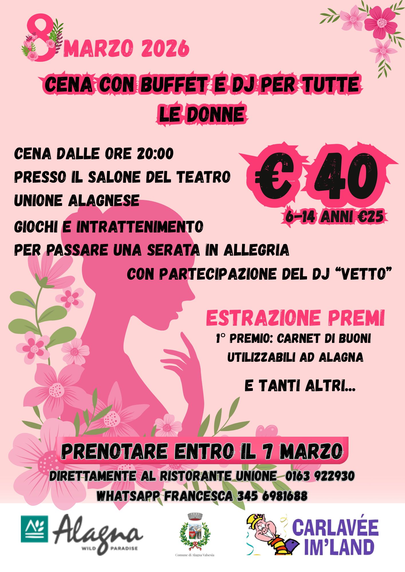 Domenica 8 marzo presso il Teatro dell'Unione Alagnese cena con dj e giochi divertenti per tutte le donne del paese e non solo dalle ore 20:00. Prenotare entro il 7 marzo direttamente presso il Ristorante Unione 0163922930