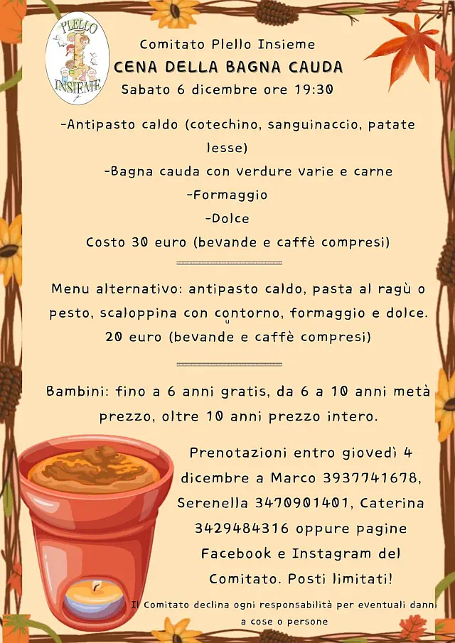 Sabato 6 dicembre il comitato Plello organizza la cena della bagna cauda, prenotazioni entro giovedì 4 dicembre,