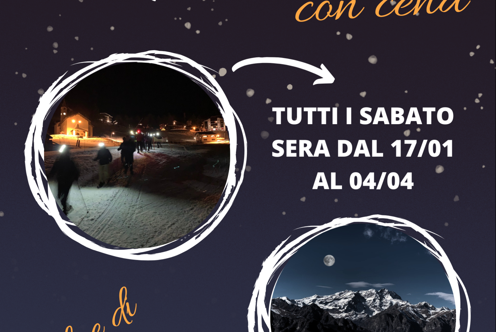 Tutti i sabati sera dal 17 gennaio al 4 aprile saranno organizzati una serie di appuntamenti serali per ciaspolare all’Alpe di Mera, ammirando la valle sottostante punteggiata dalle luci dei suoi paesi e gustando un’ottima cena. Possibilità di noleggio: kit ciaspole (ciaspole + bastoncini) e della luce frontale. Prenotazioni entro le 12 del venerdì precedente.