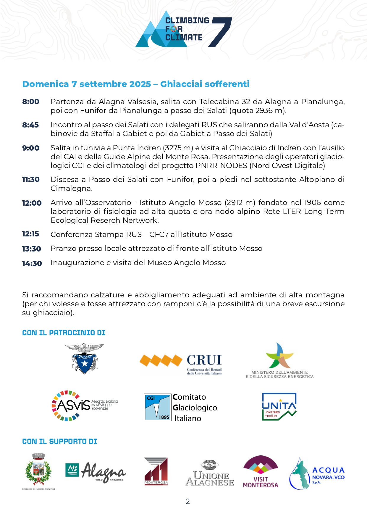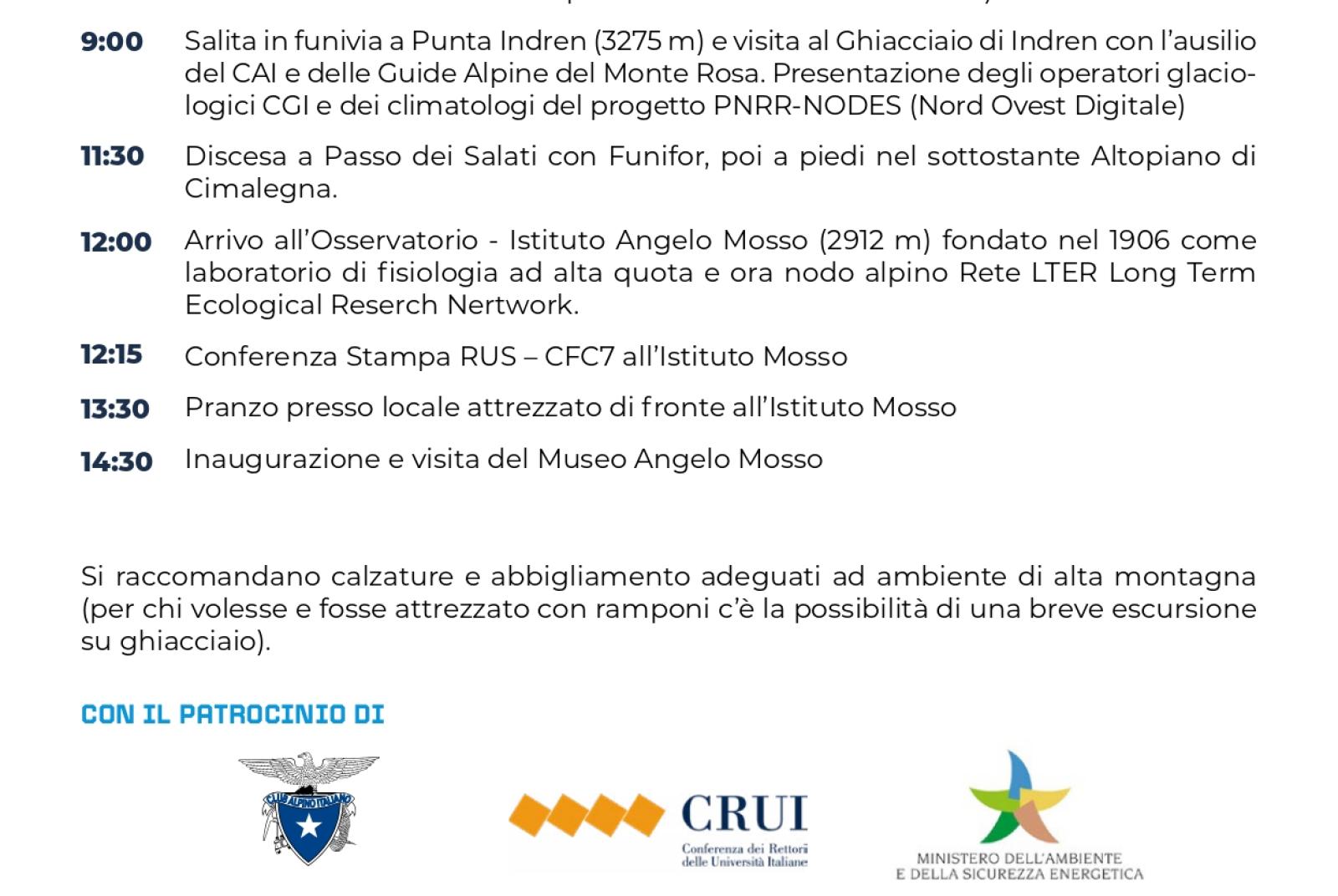 9:00 - Salita in funivia a Punta Indren (3275 m) e visita al Ghiacciaio di Indren con l’ausilio del CAI e delle Guide Alpine del Monte Rosa. Presentazione degli operatori glaciologici CGI e dei climatologi del progetto PNRR-NODES (Nord Ovest Digitale).