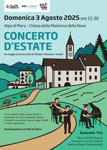 Domenica 3 agosto alle ore 15.30 presso la chiesa della Madonna delle neve all'Alpe di Mera, concerto d'estate con i Zumstein Trio. Partecipazione ad offerta libera