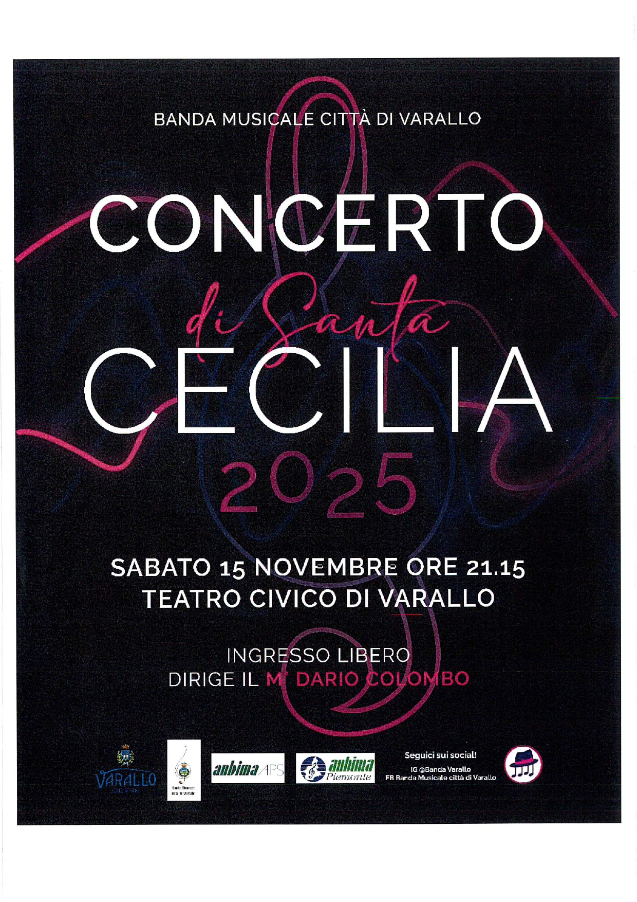 Sabato 15 novembre alle ore 21.15 presso il Teatro Civico di Varallo si terrà il concerto di Santa Cecilia. Ingresso libero, dirige il maestro Dario Colombo.