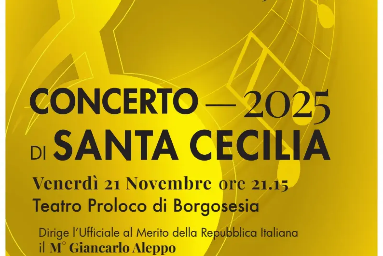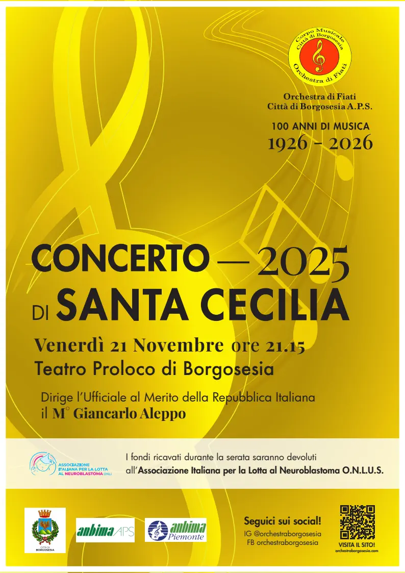 Venerdì 21 Novembre, alle ore 21:15, l’Orchestra di fiati Città di Borgosesia, diretta dal Maestro Giancarlo Aleppo, vi aspetta numerosi al teatro Pro loco di Borgosesia, per il tradizionale CONCERTO DI SANTA CECILIA. Il ricavato dell’evento sarà devoluto all’Associazione Italiana per la Lotta al Neuroblastoma O.N.L.U.S.