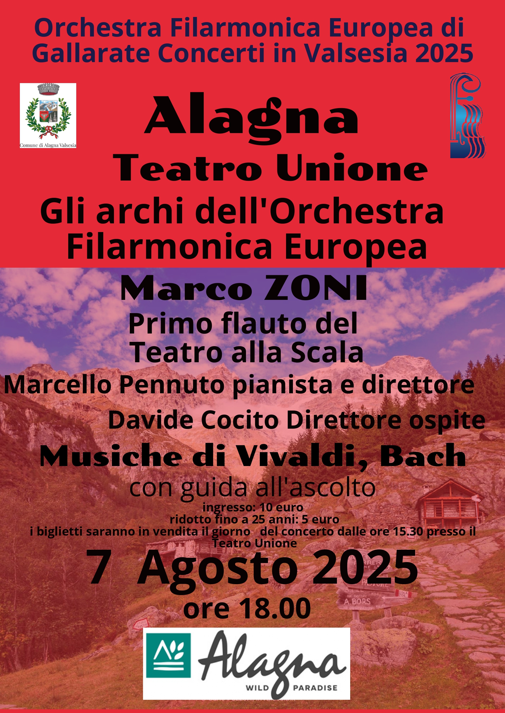 Giovedì 7 agosto sarà organizzato il concerto dell'orchestra filarmonica europea e il concerto del primo flauto del Teatro Scala di Milano Marco Zoni alle ore 18.00 presso l'Unione Alagnese