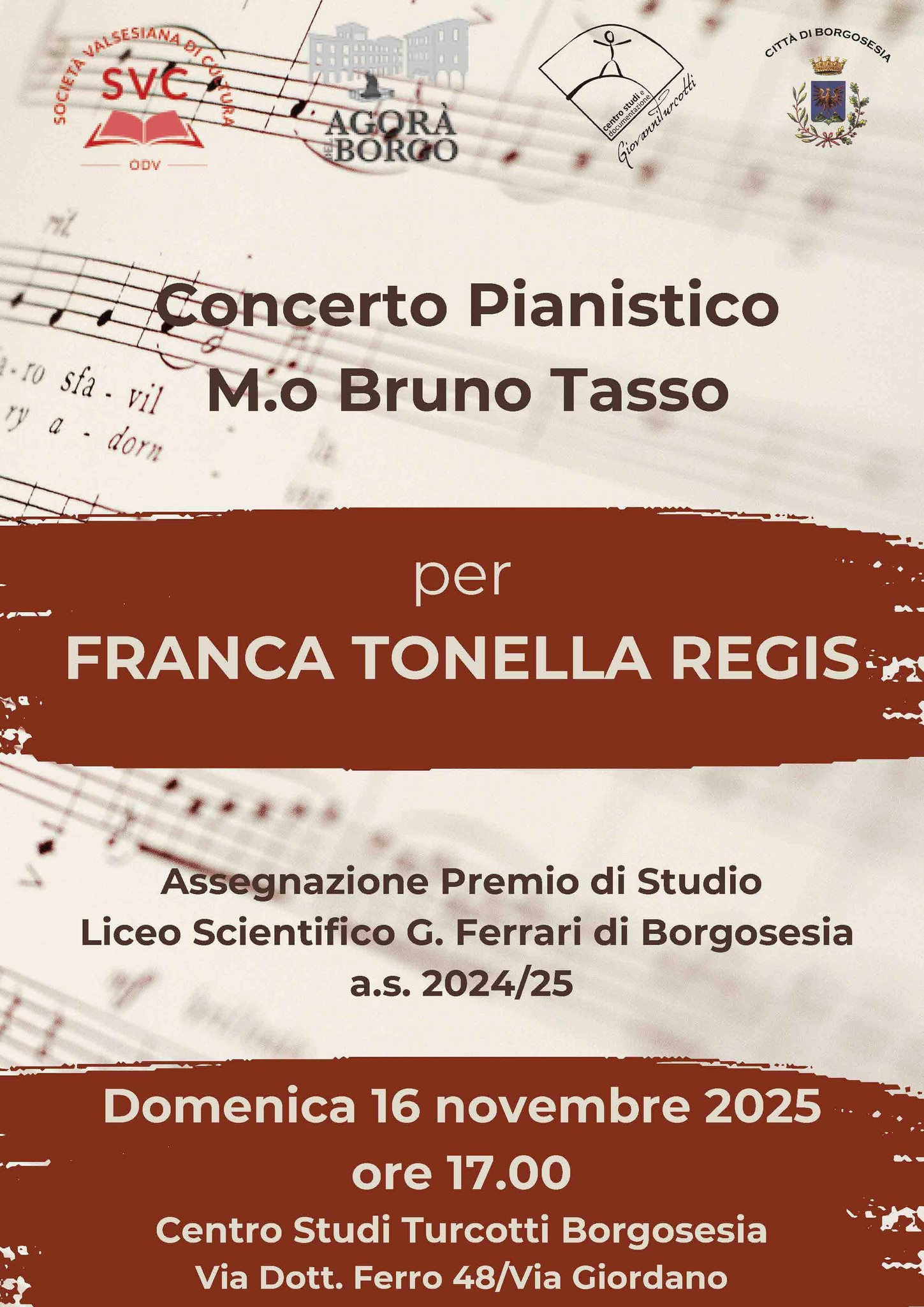 Domenica 16 novembre 2025 alle ore 17 presso il Centro Studi Turcotti, Borgosesia, il ๐๐๐๐ฌ๐ญ๐ซ๐จ ๐๐ซ๐ฎ๐ง๐จ ๐๐๐ฌ๐ฌ๐จ eseguirร musiche di Beethoven e Schubert in un concerto dedicato a ๐ ๐ซ๐๐ง๐๐ ๐๐จ๐ง๐๐ฅ๐ฅ๐ ๐๐๐ ๐ข๐ฌ, figura di spicco della cultura valsesiana. Al termine della serata verrร consegnato il ๐๐ซ๐๐ฆ๐ข๐จ ๐๐ข ๐ฌ๐ญ๐ฎ๐๐ข๐จ โ๐ ๐ซ๐๐ง๐๐ ๐๐จ๐ง๐๐ฅ๐ฅ๐ ๐๐๐ ๐ข๐ฌโ, istituito dalla ๐๐จ๐๐ข๐๐ญ๐ฬ ๐๐๐ฅ๐ฌ๐๐ฌ๐ข๐๐ง๐ ๐๐ข ๐๐ฎ๐ฅ๐ญ๐ฎ๐ซ๐ per ricordare la Professoressa e destinato a uno studente o una studentessa del ๐๐ข๐๐๐จ ๐๐๐ข๐๐ง๐ญ๐ข๐๐ข๐๐จโ๐๐๐ฎ๐๐๐ง๐ณ๐ข๐จ ๐ ๐๐ซ๐ซ๐๐ซ๐ขโ di Borgosesia, distintosi per interesse e merito nelle discipline umanistiche.