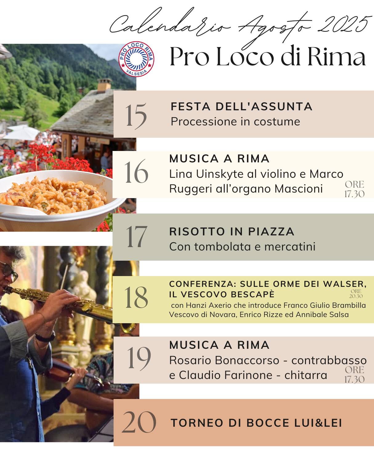 Lunedì 18 agosto alle ore 20.30 si terrà la conferenza: "Sulle orme dei walser, il vescovo Bescapè" con Hanzi Axerio che introduce Franco Giulio Brambilla Vescovo di Novara, Enrico Rizze ed Annibale Salsa