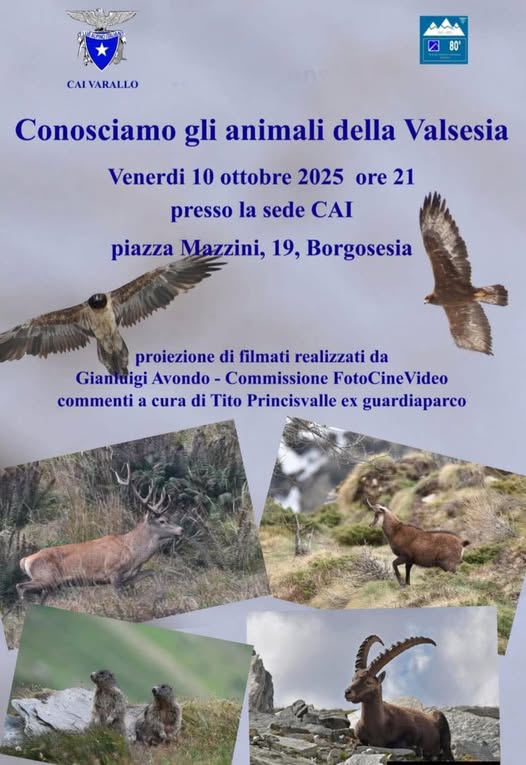 Venerdì 10 ottobre alle ore 21.00 "Conosciamo gli animali della Valsesia": proiezione di filmati realizzati da Gianluigi Avondo, commenti a cura di Tito Princisvalle ex guardiaparco, presso la sede CAI in piazza Mazzini, 19 Borgosesia.