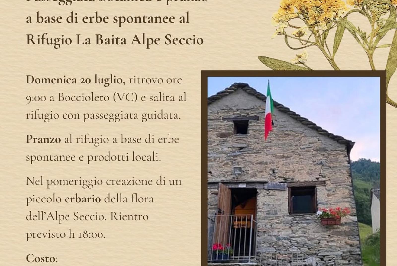 Domenica 20 luglio, passeggiata botanica con ritrovo alle ore 9.00 a Boccioleto e pranzo a base di erbe spontanee al Rifugio La Baita Alpe Seccio. Nel pomeriggio, creazione di un piccolo erbario - Rientro ore 18.00.