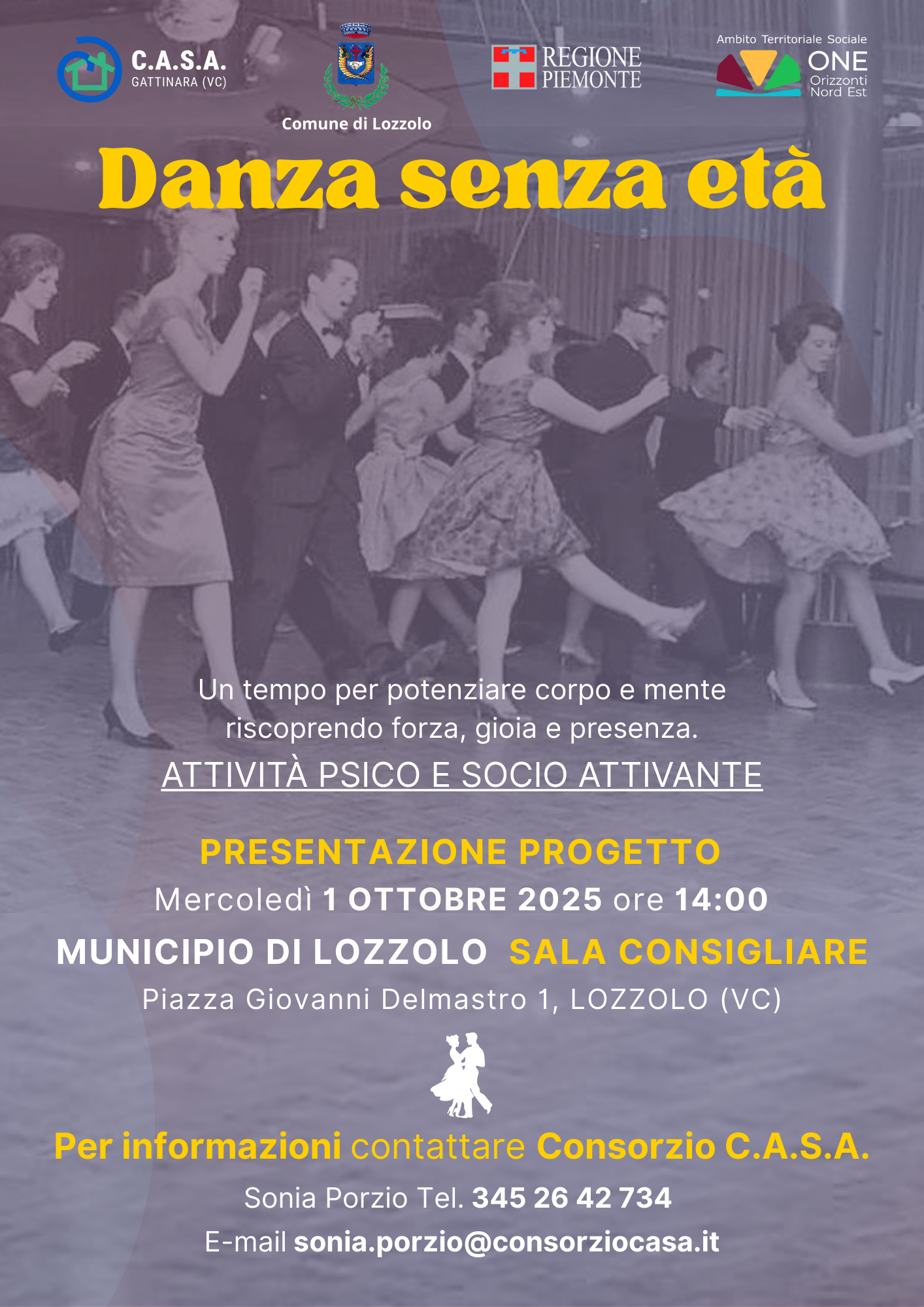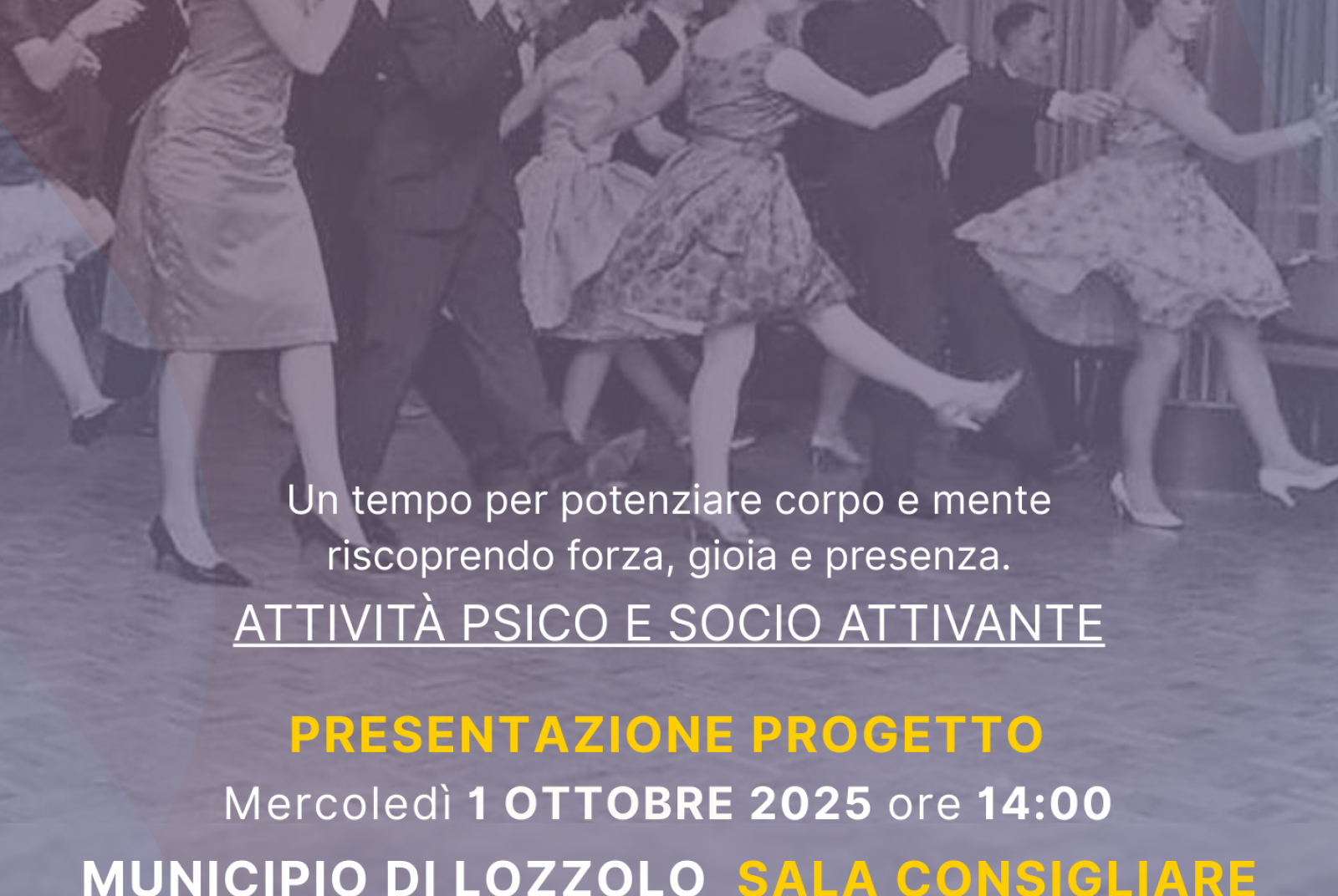 Mercoledì 1° ottobre alle 14 presso la sala consiliare del Municipio di Lozzolo, presentazione del progetto "Danza senza età": un tempo per potenziare corpo e mente riscoprendo forza, gioia e presenza.