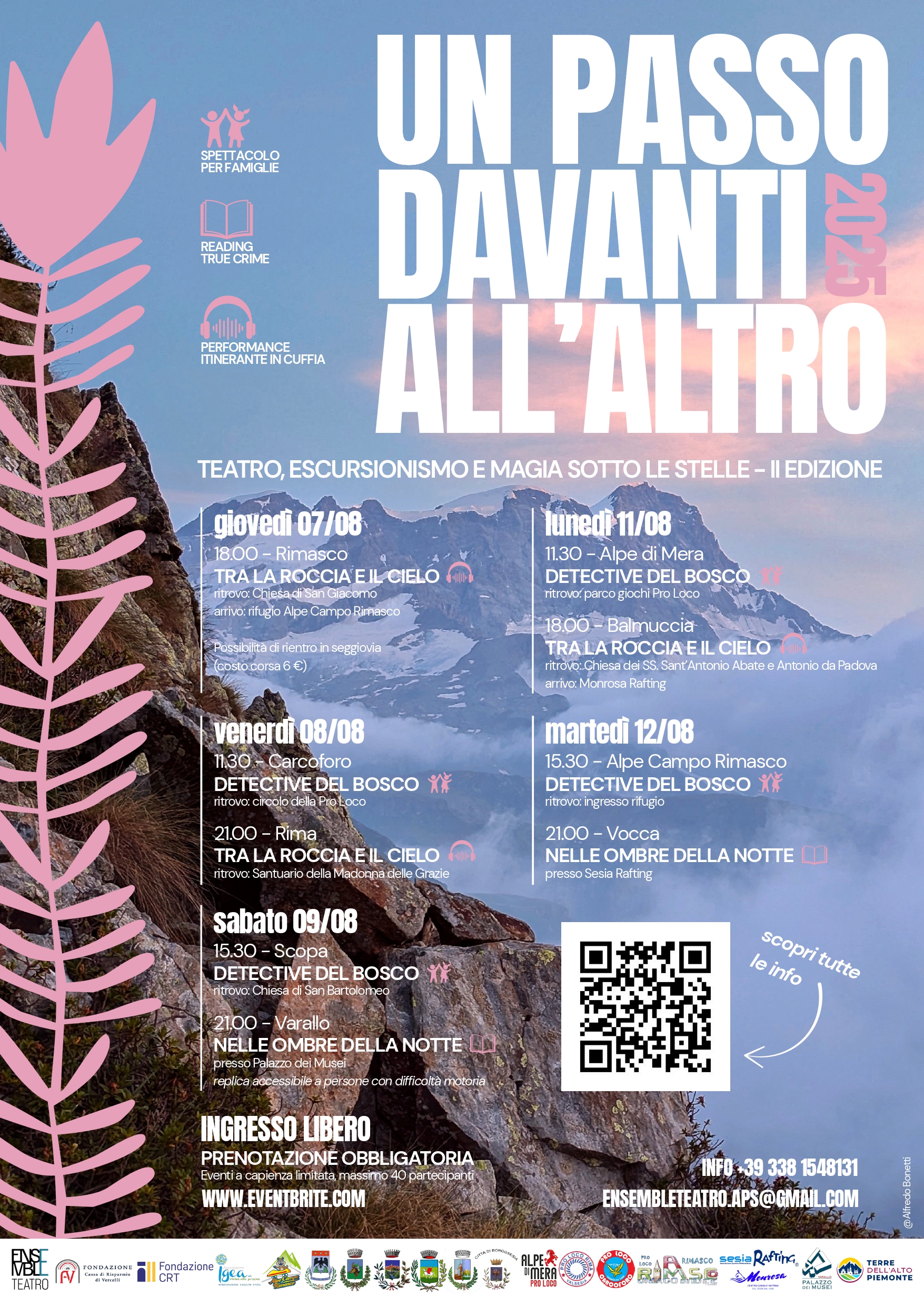 Ensemble Teatro torna in Valsesia per la II edizione di Un passo davanti all’altro! Sabato 9 agosto alle ore 15.30 a Scopa spettacolo per famiglie " Detective del bosco". Ritrovo presso la Chiesa di San Bartolomeo. Ingresso libero, prenotazione obbligatoria sul sito www.eventbrite.com, eventi a capienza limitata, massimo 40 partecipanti.