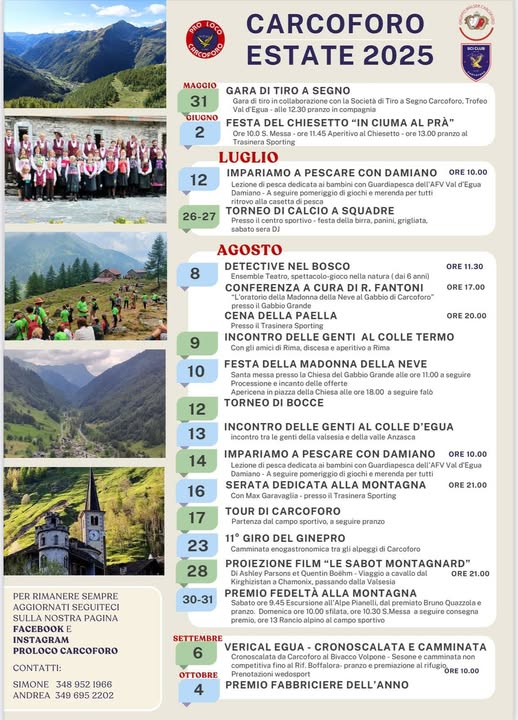 L'8 di agosto alle 17.00 conferenza a cura di R. Fantoni presso il Gabbio Grande con tematica "L'oratorio della Madonna della neve al Gabbio di Carcoforo". Infine alle 20.00 cena della paella presso il Trasinera Sporting