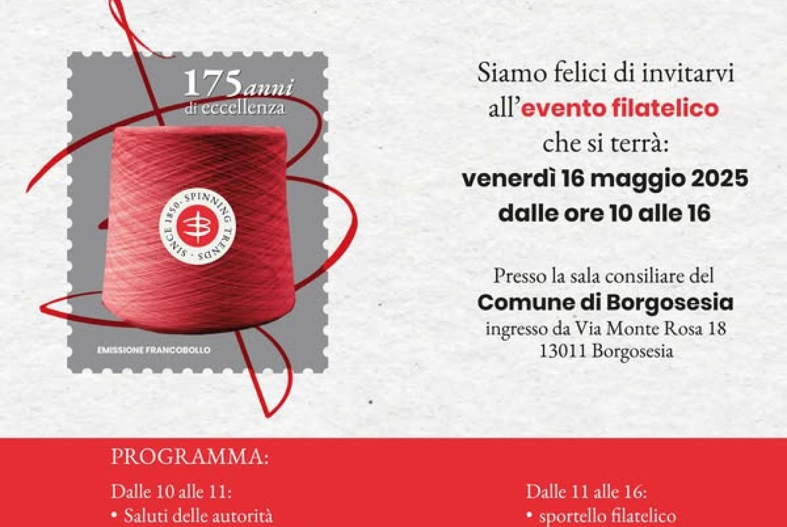 Venerdì 16 maggio 2025 dalle ore 10:00 alle 16:00 presso la Sala Consiliare del Comune di Borgosesia in Via Monte Rosa 18 sarà organizzato un Evento Filatelico in collaborazione con Zegna Baruffa Lane Borgosesia S.p.A. : un evento speciale dedicato al mondo della filatelia, tra memoria storica e cultura del territorio. Il programma della giornata prevede: dalle Ore 10:00 – 11:00 Saluti istituzionali, Presentazione del progetto filatelico, cerimonia di annullo speciale del giorno. Dalle ore 11:00 – 16:00 apertura dello sportello filatelico per collezionisti, appassionati e curiosi, un’occasione unica per scoprire la bellezza e il valore culturale della filatelia, proprio nel cuore della nostra città.