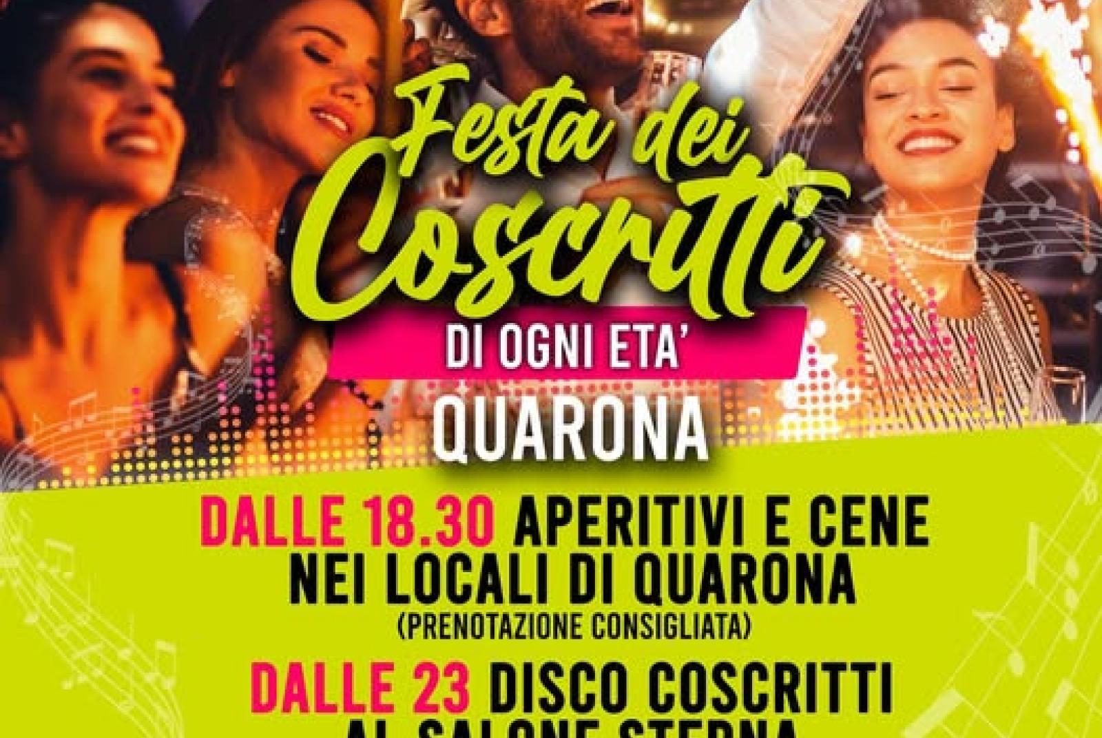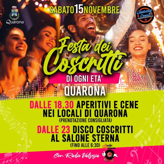 Sabato 15 novembre Festa dei coscritti di ogni età al salone Sterna di Quarona. Dalle 18.30 aperitivi e cene nei locali di Quarona e dalle 23.00 disco coscritti al salone Sterna.
