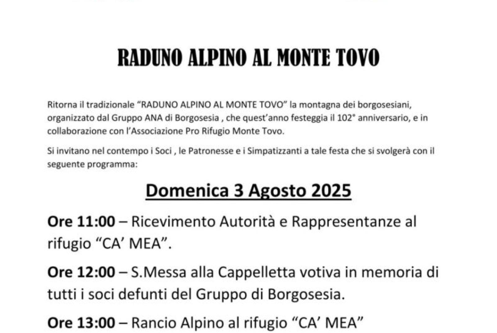 Domenica 3 agosto ritorna il tradizionale "Raduno alpino al monte tovo" la montagna dei borgosesiani, organizzato dal gruppo ANA di Borgosesia, che quest'anno festeggia il 102° anniversario e in collaborazione con l'associazione Pro Rifugio Monte Tovo