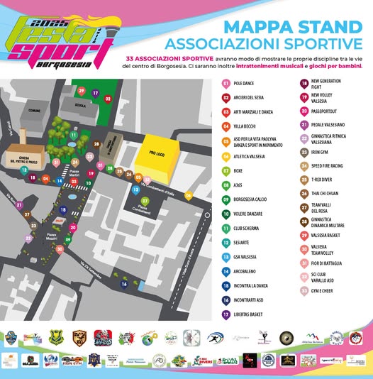 Festa dello Sport 2025: Il 13 e il 14 settembre Borgosesia si trasforma in una palestra a cielo aperto! Saranno ben 33 associazioni a colorare il centro città, pronte a farvi conoscere e provare le loro discipline. Per le vie della città non mancheranno musica e momenti di intrattenimento, con attività e divertimento dedicati anche ai più piccoli. Un’occasione unica per scoprire, vivere e scegliere lo sport che fa per te!