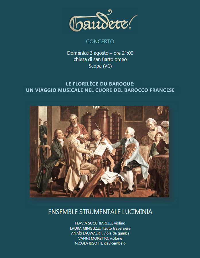 Domenica 3 agosto alle ore 21.00 presso la Chiesa di San Bartolomeo di Scopa l'ensemble strumentale Luciminia presenta "Le florilège du Baroque: un viaggio musicale nel cuore del barocco francese"