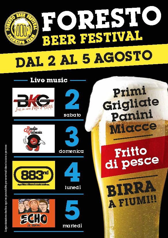 Dal 2 al 5 agosto torna il Foresto BeerFest con quattro serate di allegria! Ad accompagnare le cene ci sarà anche la musica: sabato 2 si balla con la band BKG, domenica 3 in compagnia dei dj di Radio Valsesia, lunedì 4 con gli 883nd, band tributo al celebre gruppo di Max Pezzali e, a chiudere la festa, martedì 5 agosto ci si scatena con gli "Echo the group".