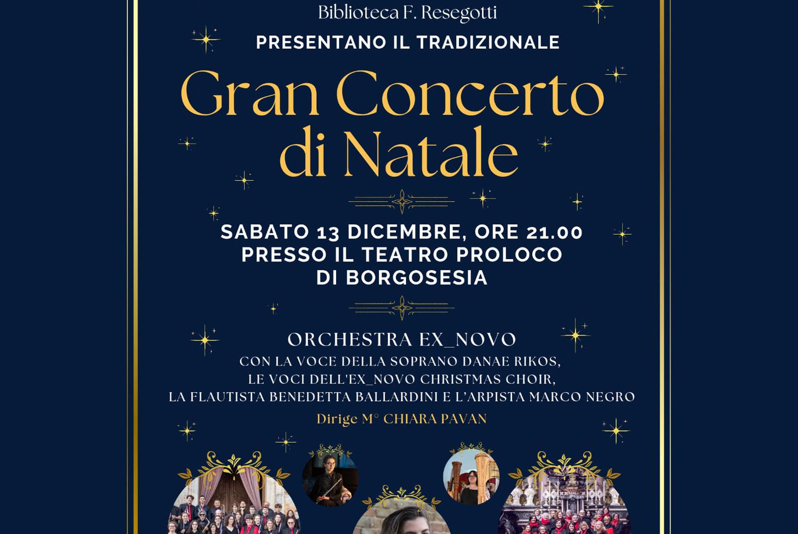 Sabato 13 dicembre alle ore 21.00 presso il teatro Pro Loco di Borgosesia, si terrà il grande concerto di Natale. L’Orchestra Ex Novo si esibirà insieme alla soprano Danae Rikos, all’Ex Novo Christmas Choir, alla flautista Benedetta Ballardini e all’arpista Marco Negro, sotto la direzione del M° Chiara Pavan. Ingresso libero.