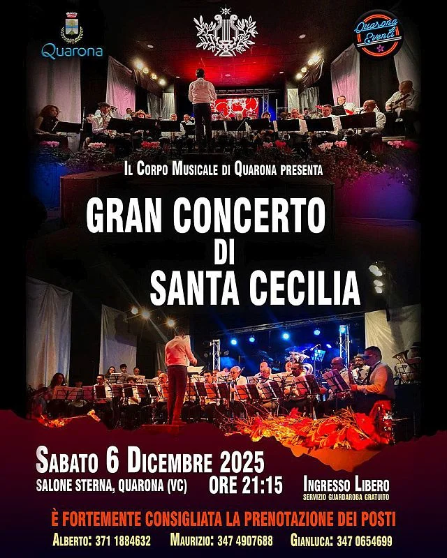 Il Corpo Musicale di Quarona invita a una serata dedicata a Santa Cecilia, patrona dei musicisti. Il concerto si terrà nel Salone Sterna sabato 6 dicembre alle ore 21:15 e proporrà un programma pensato per valorizzare il lavoro dell’ensemble e la tradizione bandistica del paese. Ingresso libero: È consigliata la prenotazione dei posti.