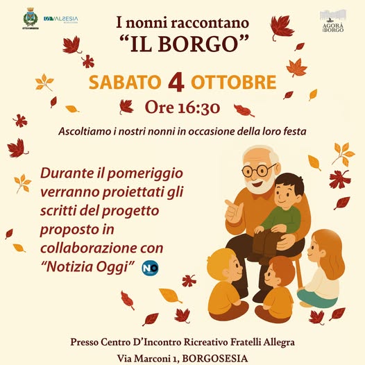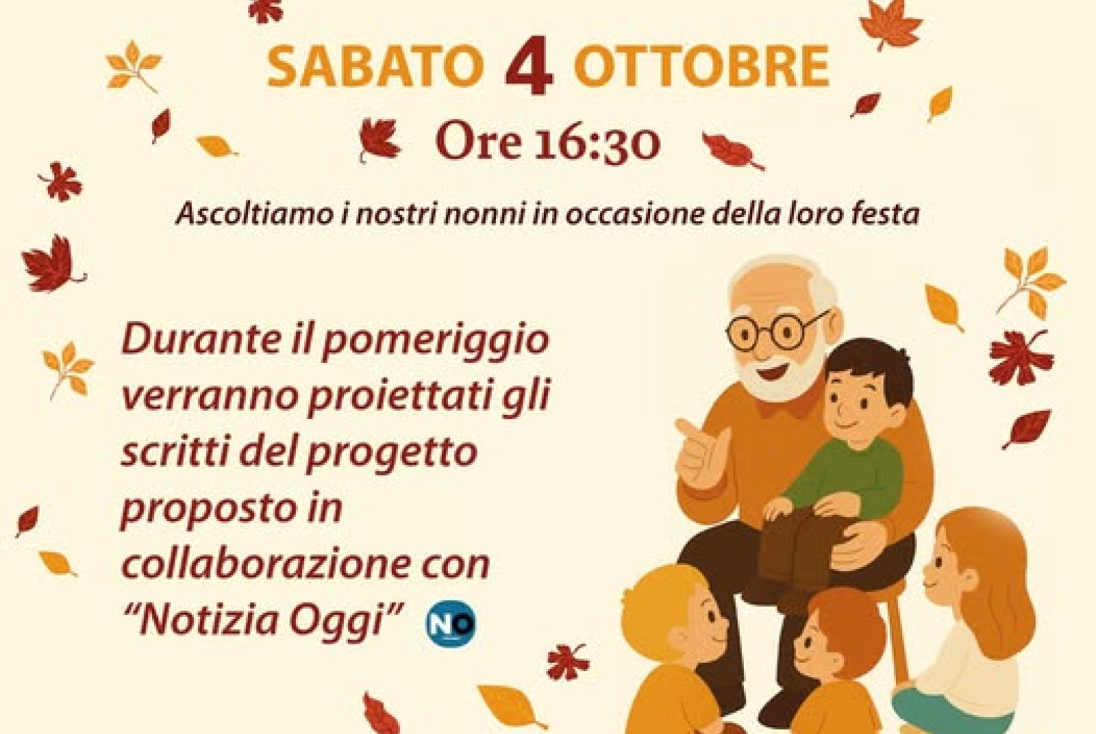 Sabato 4 ottobre alle ore 16:30 presso il Centro d’Incontro Ricreativo Fratelli Allegra, in occasione della Festa dei Nonni, sarà organizzato un pomeriggio speciale per ascoltare i loro racconti e custodire insieme la memoria del nostro territorio. Durante l’incontro verranno proiettati gli scritti del progetto realizzato in collaborazione con Notizia Oggi. Sarà un momento di comunità, ricordi ed emozioni per celebrare chi rappresenta le radici della nostra storia.