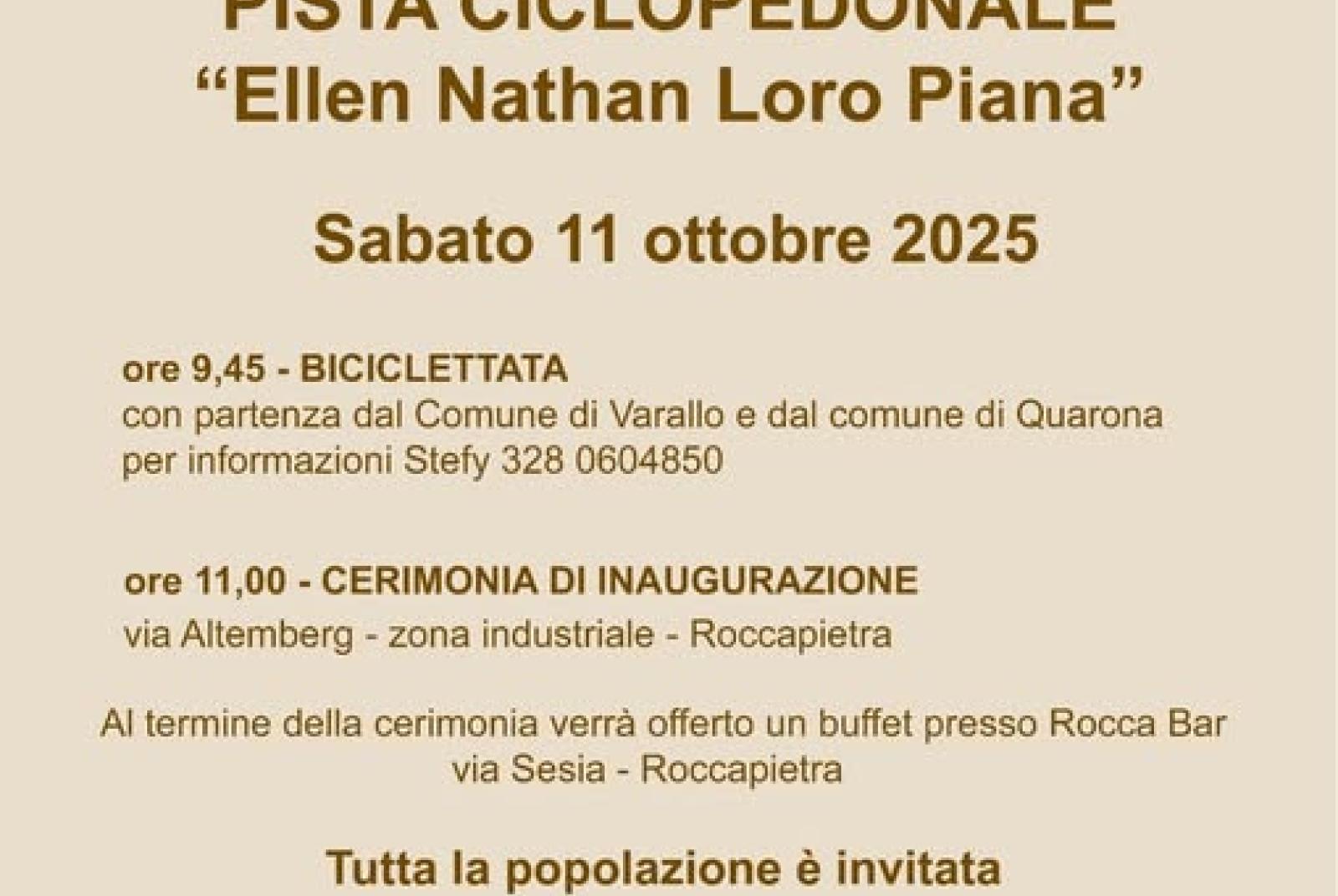 La cittadinanza è invitata all'evento, curato dal Soroptimist Valsesia, di inaugurazione della pista ciclopedonale "Ellen Nathan Loro Piana": sabato 11 ottobre alle ore 11, con partenze dal Comune di Quarona e dal Comune di Varallo alle ore 9,45 e buffet conclusivo.