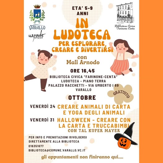 Sta per iniziare un ciclo di incontri-laboratorio gratuiti nella Ludoteca della Biblioteca civica, con Mali Arnodo, indirizzati a bambini di età compresa tra i 5 e i 9 anni. Il primo appuntamento sarà: venerdì 24 ottobre, ore 16.45: "Creare animali di carta e yoga degli animali", un laboratorio creativo dove i bambini realizzeranno simpatici animali con la carta e scopriranno posizioni di yoga ispirate al mondo animale.
