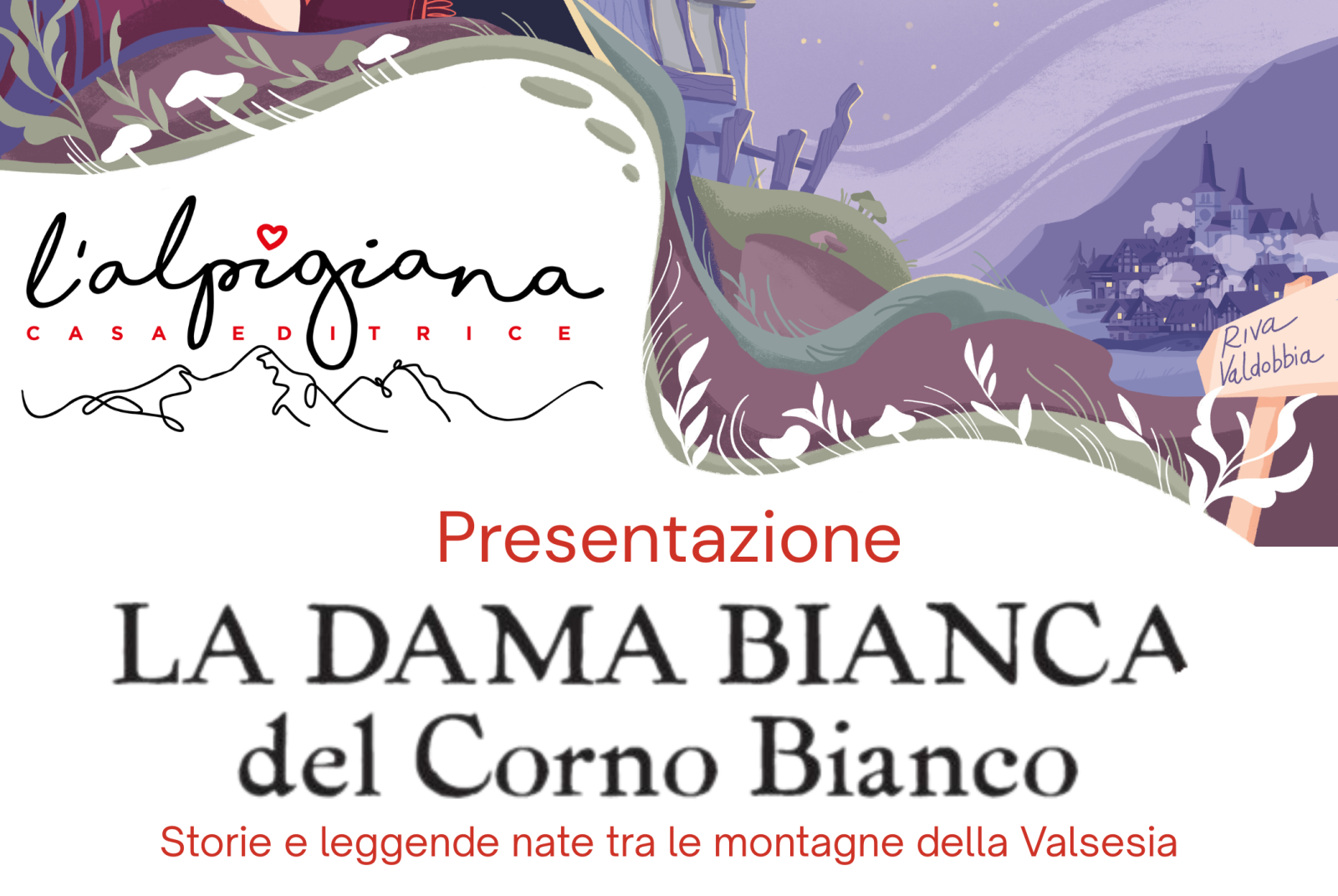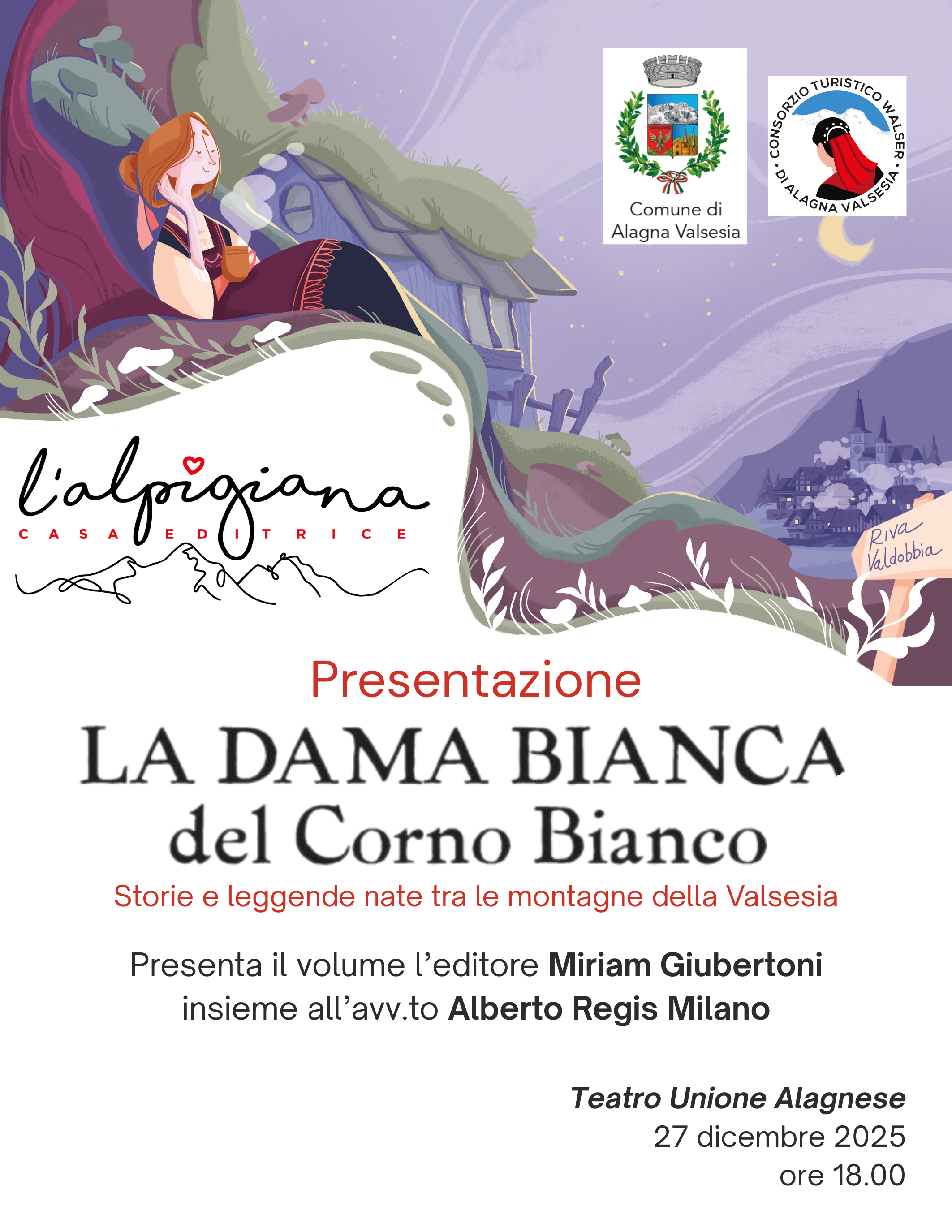 Il 27 dicembre alle ore 18.00 presso il Teatro dell'Unione Alagnese si terrà la presentazione del volume "La dama bianca del Corno Bianco" storie e leggende nate tra le montagne della Valsesia, a cura dell'editrice Miriam Giubertoni, insieme all'avvocato Alberto Regis Milano