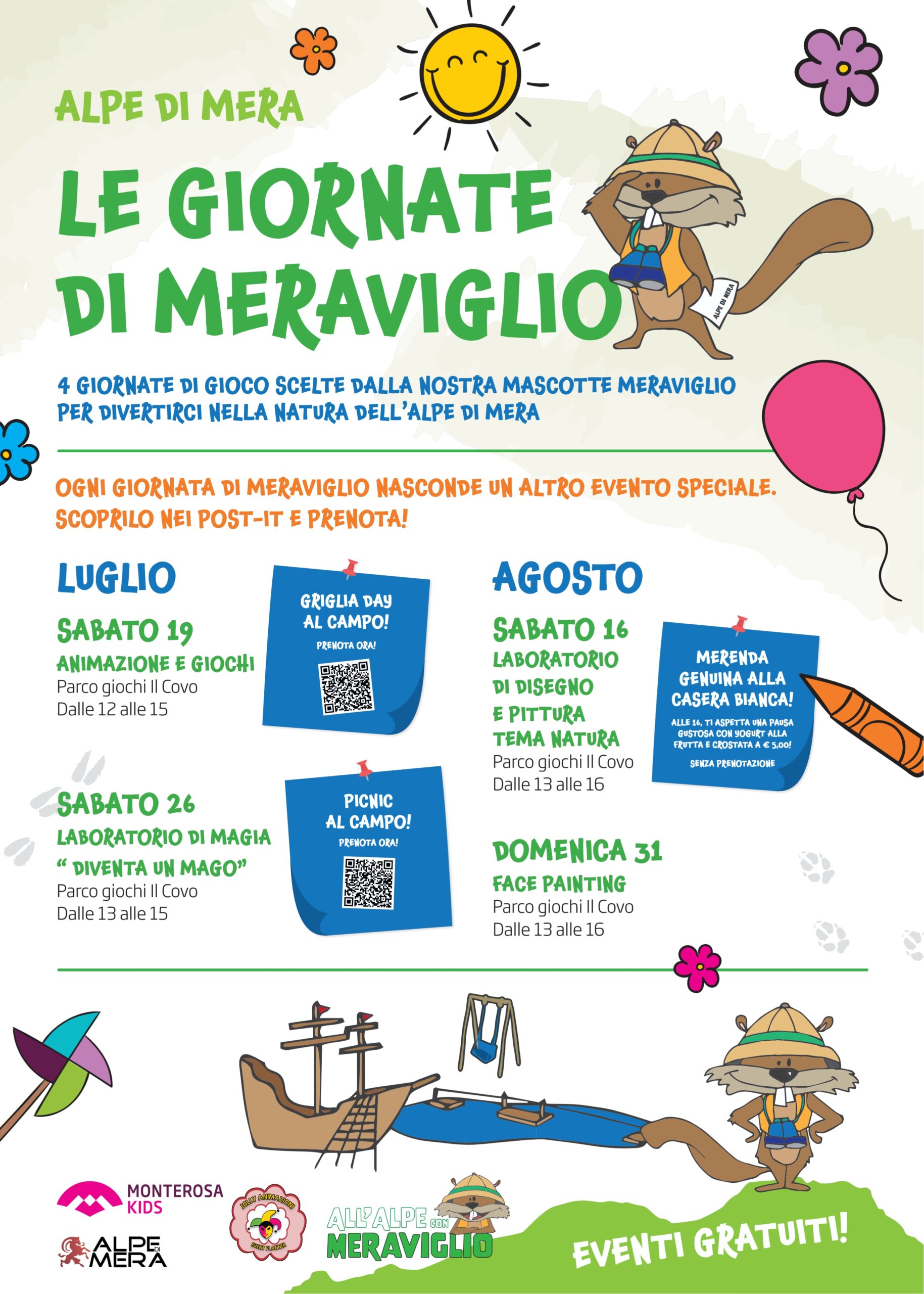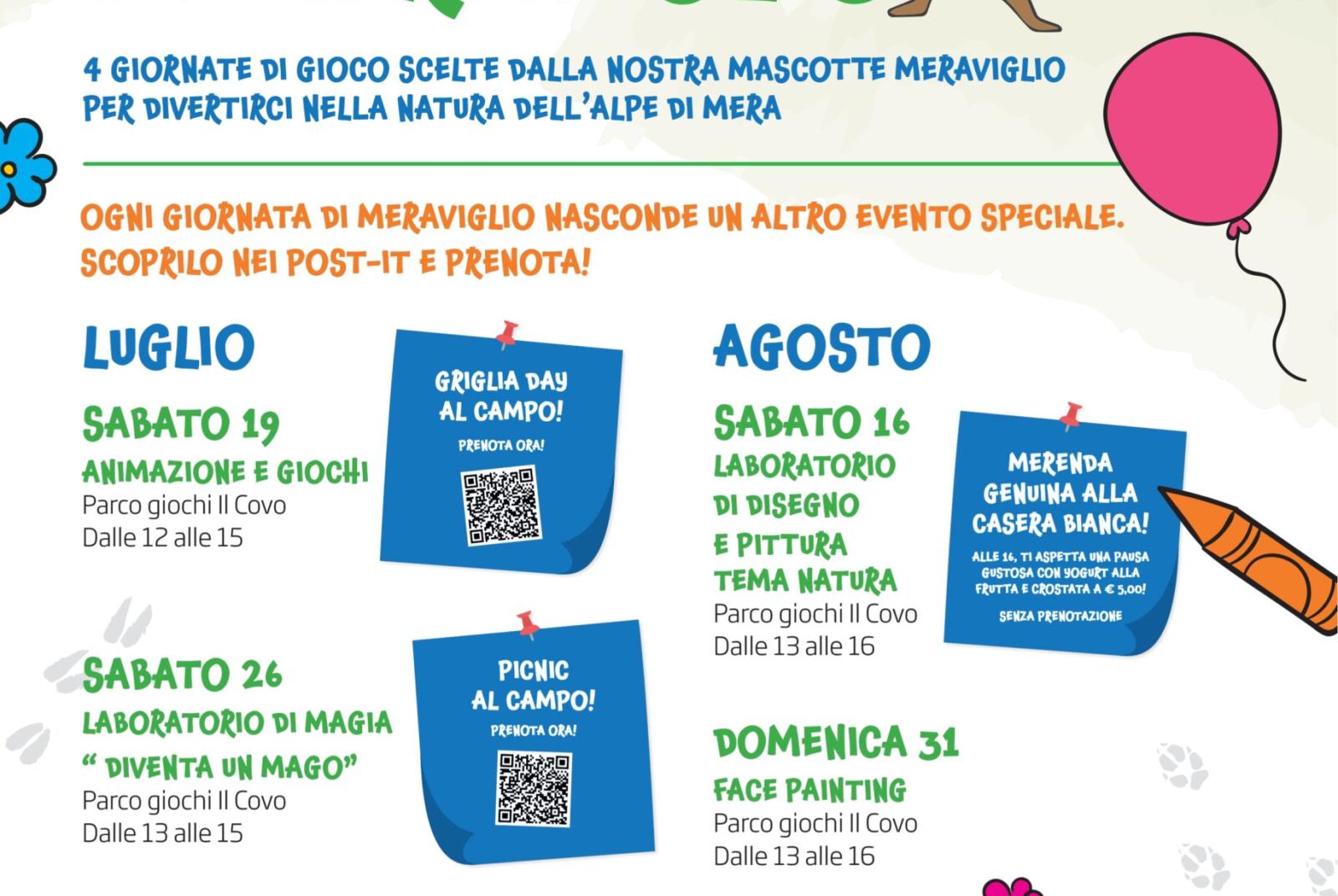 Anche quest'estate tornano le imperdibili Giornate di Meraviglio: 4 appuntamenti speciali scelti dalla simpatica mascotte Meraviglio per vivere la natura dell’Alpe di Mera in compagnia di giochi, laboratori e tanto divertimento gratuito per bambini e famiglie! Tutte le attività si svolgono al Parco Giochi Il Covo, immerso nel verde, e sono completamente gratuite! La terza delle giornate sarà un laboratorio di disegno e pittura a tema natura al parco giochi Il Covo dalle 13.00 alle 16.00