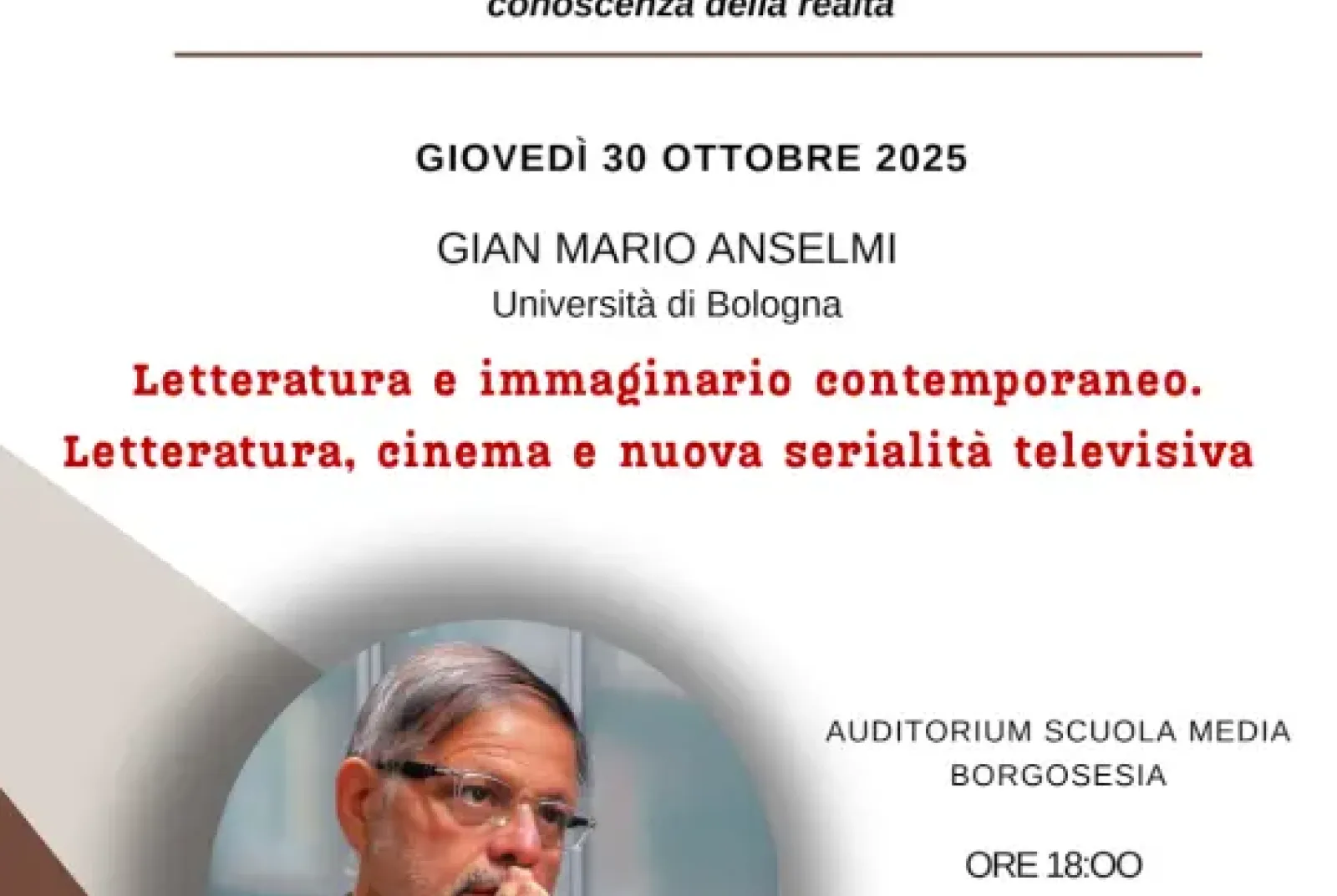 Giovedì 30 ottobre alle ore 18 presso l'auditorium delle scuole Medie di Borgosesia, si terrà il primo incontro del ciclo “Il mondo oggi e la Letteratura” organizzati dalla Società Valsesiana di Cultura. Relatore sarà il prof. Gian Mario Anselmi, figura di spicco della cultura italiana, docente dell’Università di Bologna. Il ciclo di conferenze invita a riflettere su una domanda attualissima: che posto ha oggi la Letteratura in un mondo dominato da scienza, tecnologia e serie TV