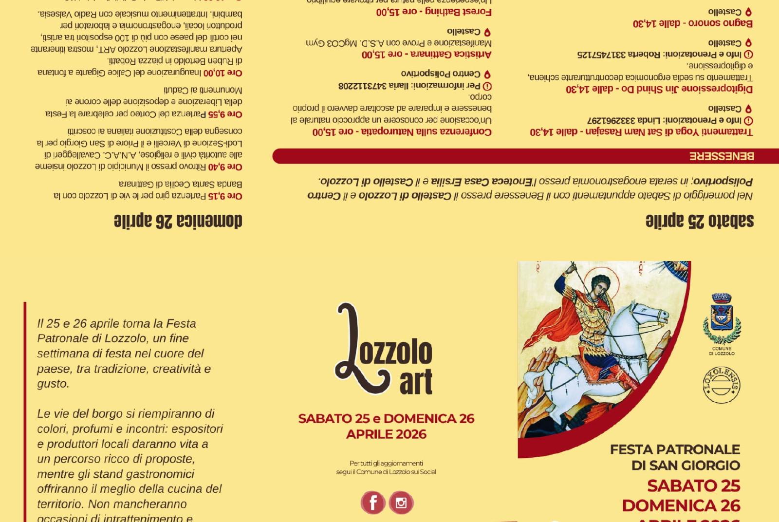 Anche quest’anno la festa patronale di San Giorgio sarà all’insegna della cultura. Tutto è pronto per un fine settimana all’insegna della tradizione, storia, arte, cultura, enogastronomia, benessere e famiglia. La tradizionale Festa Patronale sarà ampliata con LozzoloART: l'appuntamento è fissato per sabato 25 e domenica 26 aprile, con un programma itinerante in tutto il centro storico, che vede interessati 12 cortili, più di 60 hobbisti lungo le vie, 10 laboratori per bambini, street food, 20 associazioni di volontariato e ben 35 artisti tra cui Antonio Toma e Piero Motta. Al mattino di domenica 26 aprile si svolgerà anche la celebrazione della “Festa della Liberazione” con il consueto programma: le priore di San Giorgio insieme alla Banda Santa Cecilia di Gattinara, alle autorità, al parroco Don Renzo, renderanno omaggio ai monumenti ai caduti ed a seguire la benedizione della tradizionale fagiolata e del pan metà