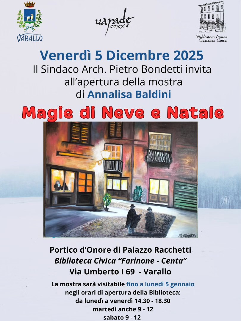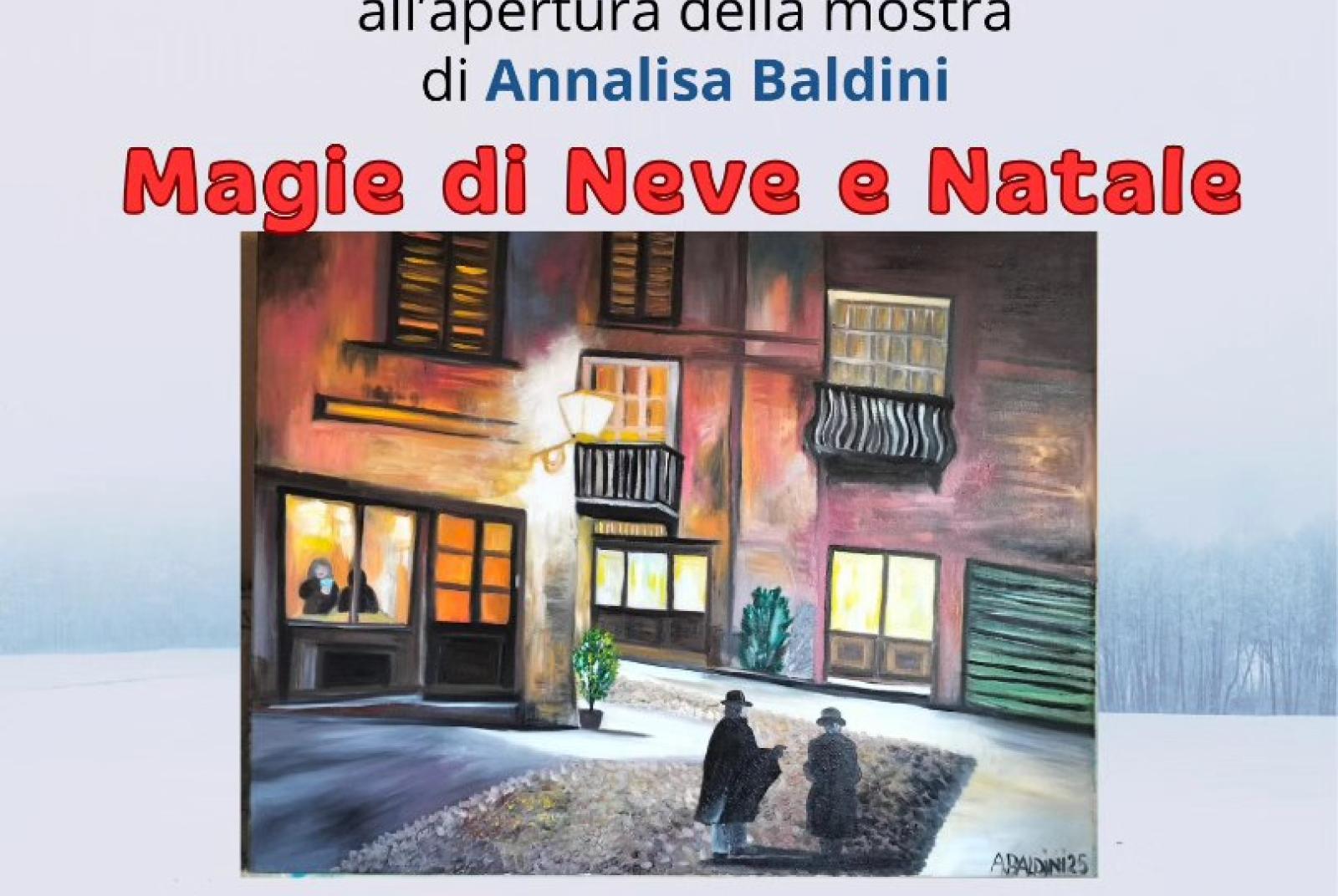 Durante il periodo natalizio si terrà una nuova mostra in Biblioteca: "Magie di Neve e Natale" di Annalisa Baldini. L'inaugurazione avverrà al mattino di venerdì 5 dicembre dopo la presentazione del Natale in Biblioteca (Libri in Libertà).