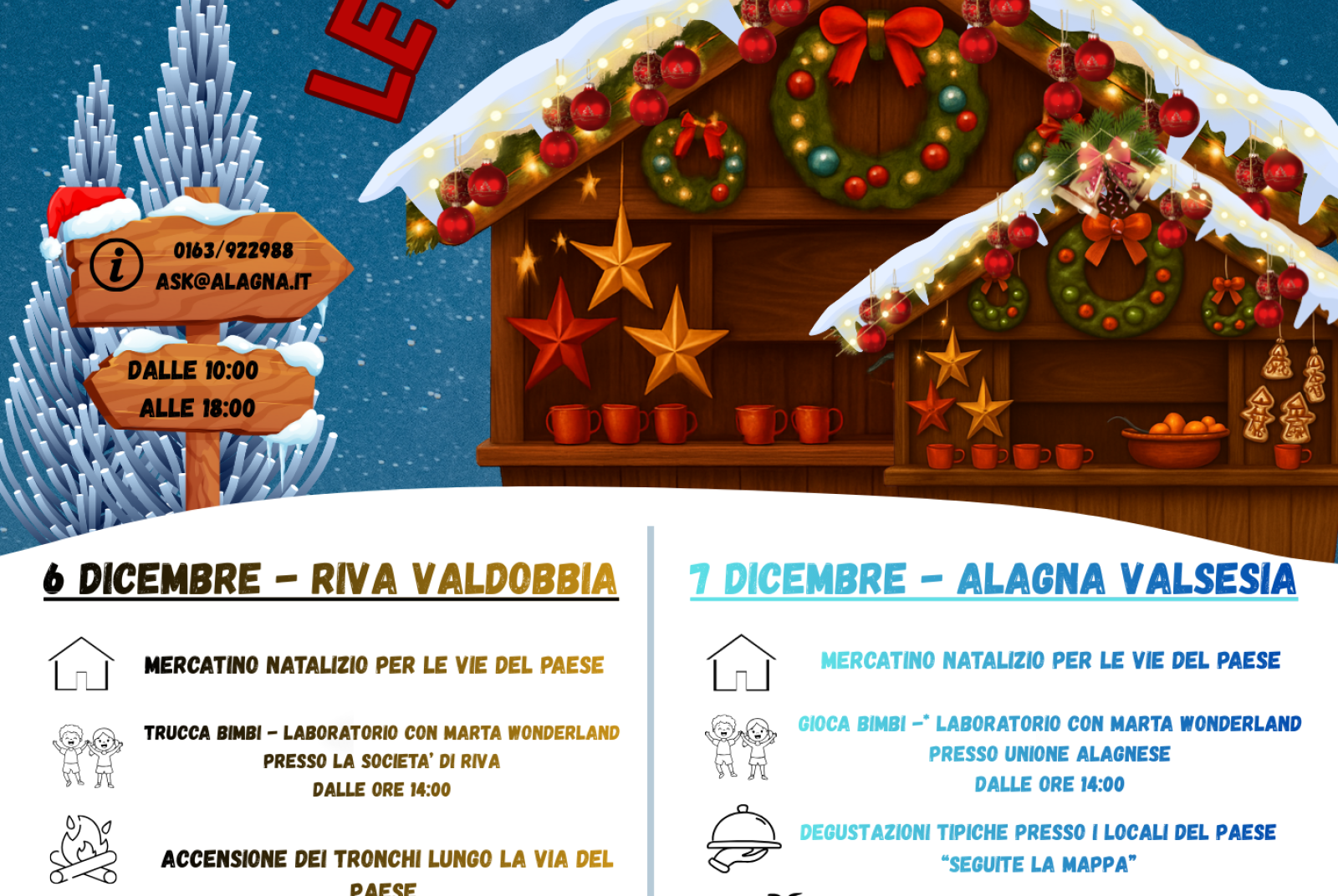 Sabato 6 dicembre a Riva Valdobbia dalle 10 alle 18 mercatino di Natale per le vie del paese, trucca bimbi laboratorio con marta Wonderland presso la Società di Riva, accensione dei tronchi lungo la via del Paese, degustazioni tipiche nel centro, cassetta per imbucare le letterine dei più piccoli, sorrisi buffi con babbo Natale!