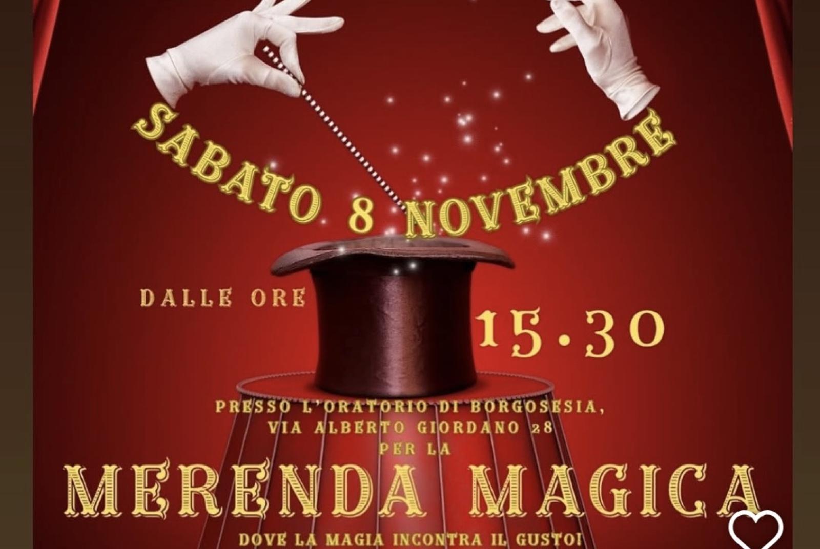 Sabato 8 novembre alle 15.30 presso l'Oratorio di Borgosesia in via Alberto Giordano 28, Il Gruppo Aido Intercomunale Valsesia vi invita all’evento MERENDA MAGICA! Dove la magia incontra il gusto, ci sarà il Mago Arcobaleno, un vero maestro delle illusioni, pronto a far apparire sorrisi e meraviglie! E dopo la magia, tutti pronti per una golosissima merenda! Dolcetti, bibite e l'energia giusta per far sognare i più piccoli.