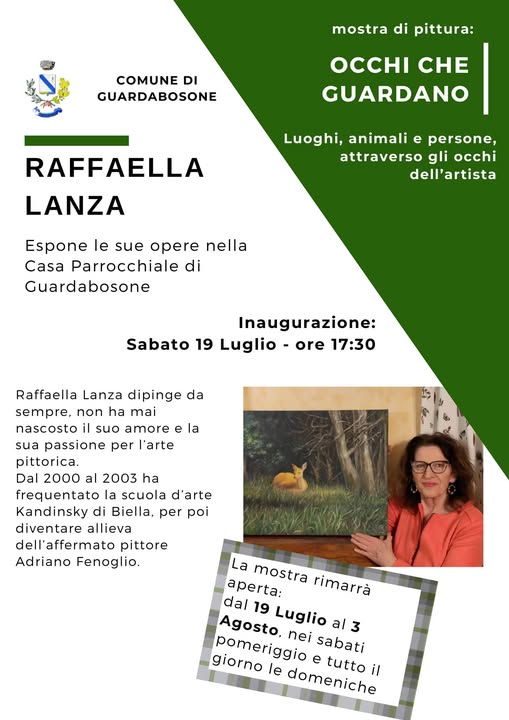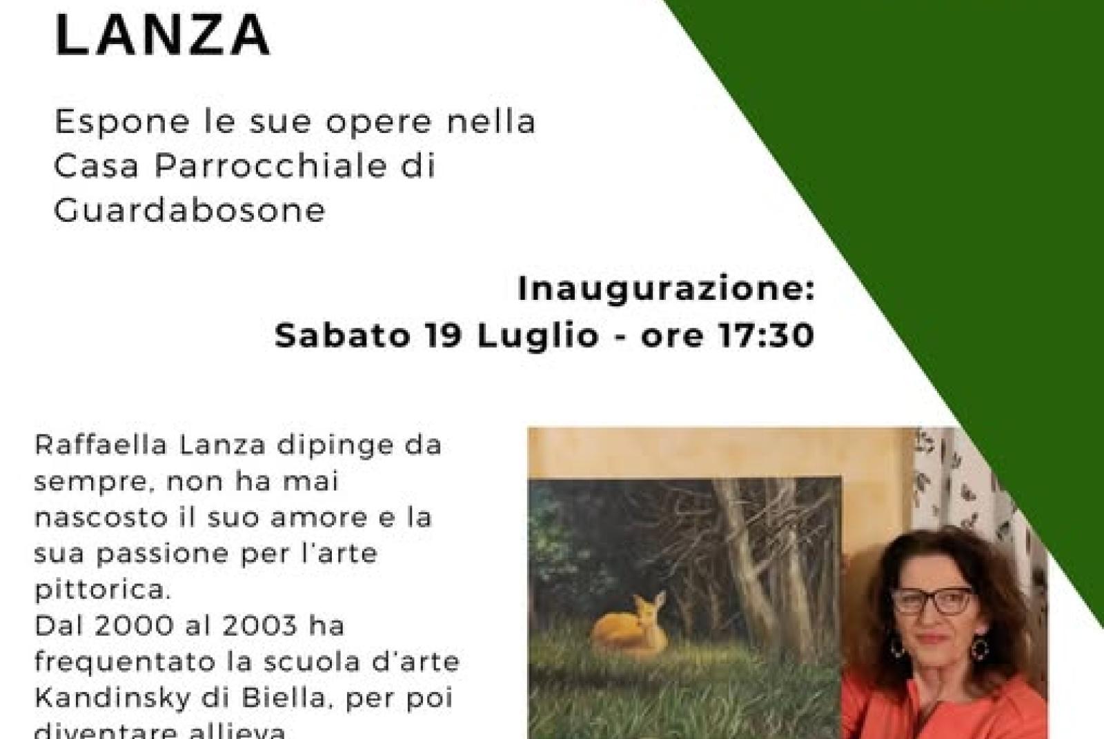 Dal 19 Luglio al 3 Agosto si svolgerà la mostra di pittura di Raffaella Lanza presso la Casa Parrocchiale di Guardabosone. Inaugurazione sabato 19 Luglio alle ore 17:30, con la presentazione della Dott.ssa Piera Mazzone.