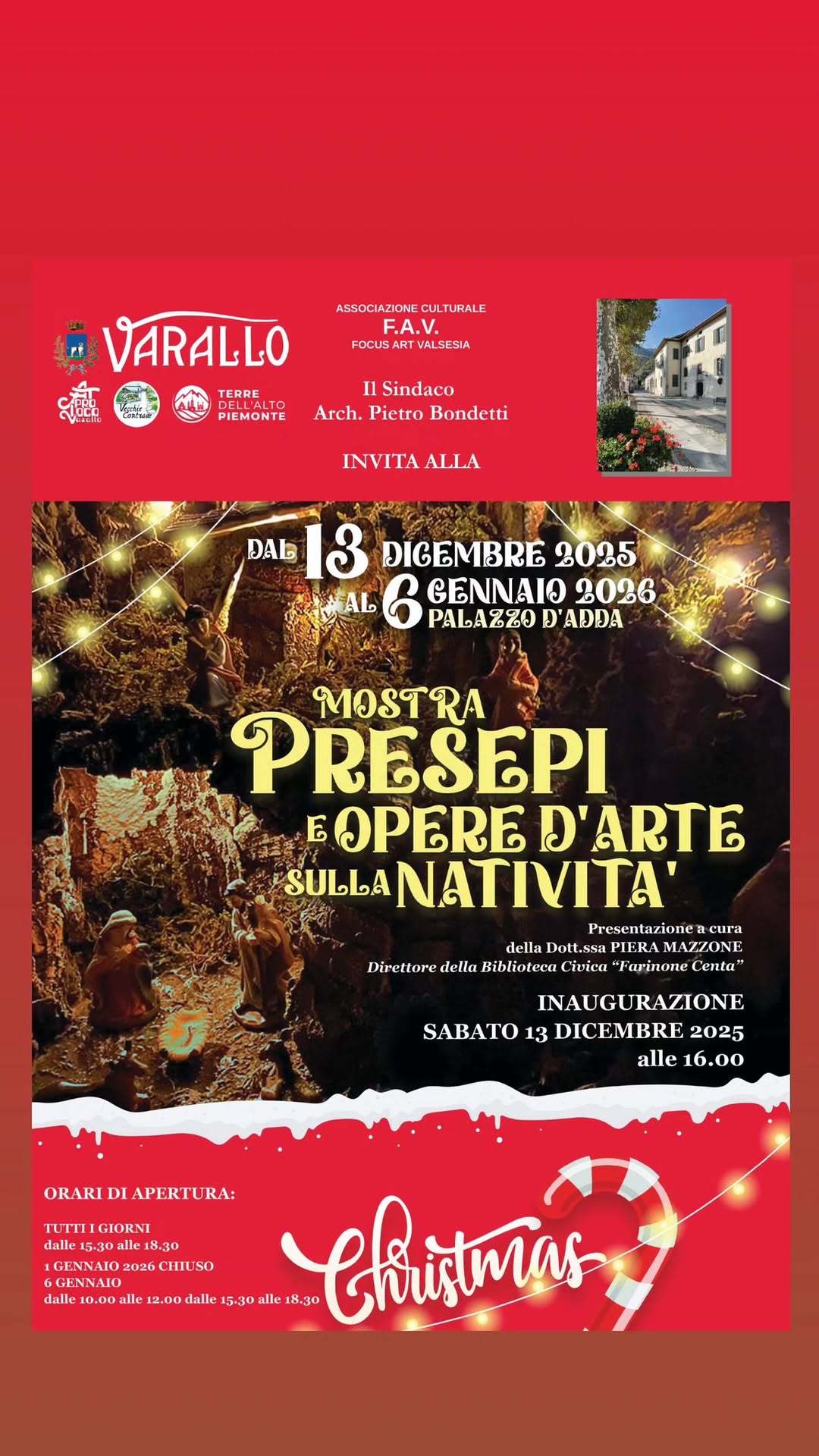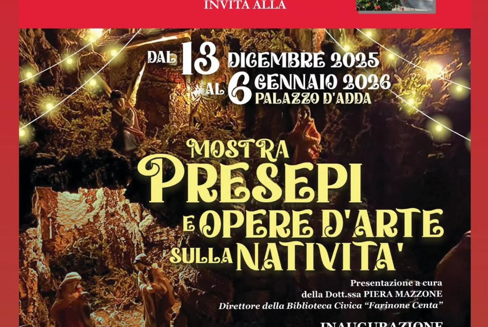 Dal 13 dicembre al 6 gennaio presso Palazzo d'Adda si terrà la mostra sui presepi e sulle opere d'arte sulla natività, l'inaugurazione della mostra sarà sabato 13 dicembre alle ore 16.00. Gli orari di apertura della mostra saranno i seguenti: tutti i giorni dalle 15.30 alle 18.30, 1 gennaio chiusa, il 6 gennaio anche al mattino dalle 10.00 alle 12.00.