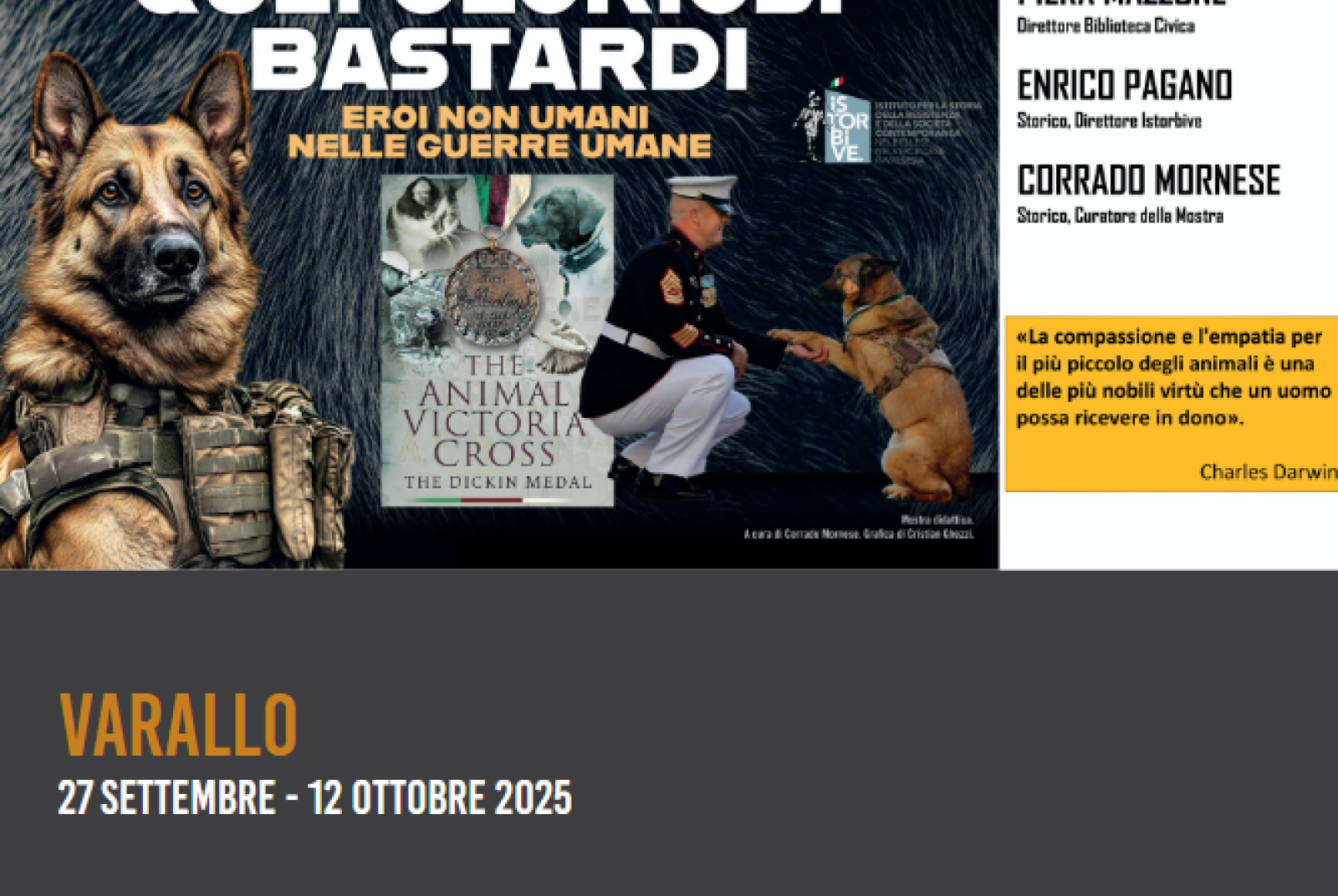 A Varallo, sabato 27 settembre 2025, alle ore 11, sarà inaugurata, alla Biblioteca Civica “Farinone Centa”, nel Cortile d’Onore di Palazzo Racchetti, la mostra Quei gloriosi bastardi. Eroi non umani nelle guerre umane, realizzata per l’Istorbive da Corrado Mornese con la grafica di Cristian Ghezzi. La mostra sarà visitabile fino a domenica 12 ottobre, nei seguenti orari: lunedì, mercoledì, giovedì e venerdì 14.30-18.30; martedì 9-12 e 14.30-18.30; sabato 9-12 e 15-18; domenica 15-18.