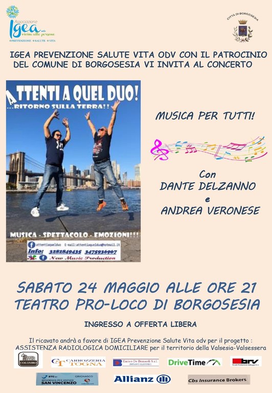Sabato 24 maggio alle ore 21.00 presso il Teatro Pro Loco di Borgosesia l'associazione IGEA Prevenzione Salute Vita ODV, con il patrocinio del Comune di Borgosesia, invita tutta la cittadinanza al concerto “Musica per Tutti!”, un evento benefico all’insegna della solidarietà e della buona musica. Sul palco si esibiranno Dante Delzanno e Andrea Veronese, l’ingresso è a offerta libera e il ricavato sarà interamente devoluto ad IGEA Prevenzione e Salute per il progetto di Assistenza Radiologica Domiciliare, dedicato ai residenti della Valsesia e Valsessera.