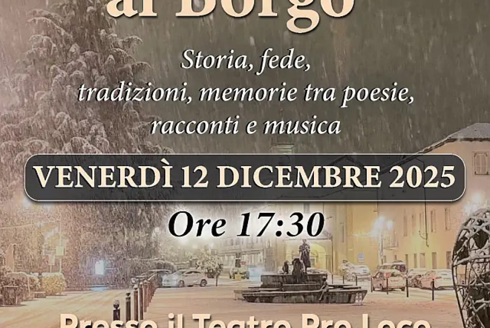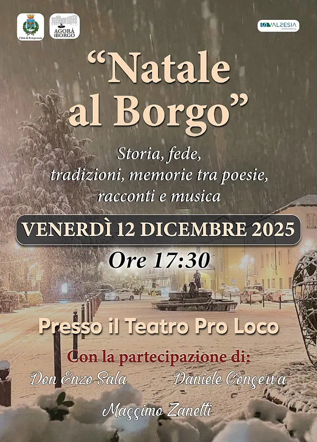 Il 12 dicembre alle ore 18.00 presso il teatro Pro Loco di Borgosesia "Natale al Borgo" a cura dell'associazione Agorà. La serata culturale vedrà l’alternarsi di momenti musicali, curati da Daniele Conserva, che canterà brani legati al Natale accompagnandosi con la chitarra, e Massimo Zanetti che con il suo prezioso violino eseguirà brani suggestivi del repertorio classico e moderno. Gianna Poletti e Monica Bergamasco, entrambe insegnanti, proporranno la lettura di poesie natalizie. Ci sarà poi un momento di riflessione, affidato a tre personalità di grande capacità analitica ed espositiva: il prof. Alessandro Orsi, che parlerà delle origini del Natale, nato come festa pagana, arrivando a raccontare alcuni significativi “Natali” borgosesiani; Don Enzo Sala, parroco di Borgosesia, tratteggerà il Natale Cristiano, con le sue tradizioni e il suo ruolo di festa familiare; infine, il prof. Bruno Rinaldi avrà il compito di analizzare il Natale dei giorni nostri.
