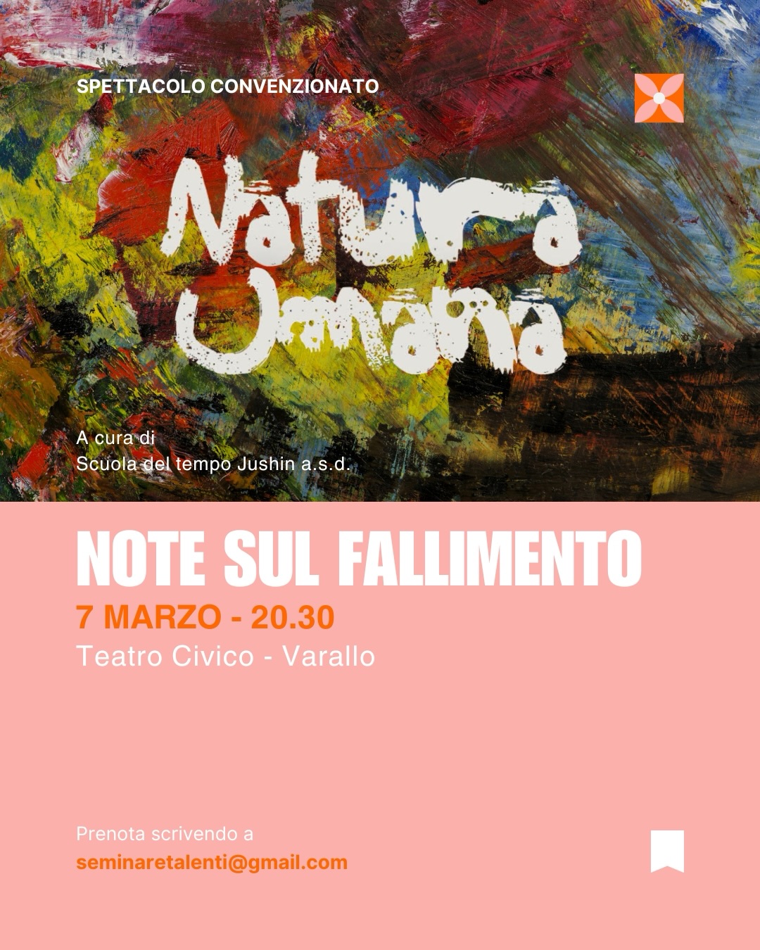 Sabato 7 marzo presso il teatro civico di Varallo spettacolo "Natura umana, note sul fallimento" a cura di Scuola del tempo Jushin a.s.d.; lo spettacolo è inserito all'interno di un ciclo di appuntamenti teatrali pensati per ragazzi e ragazze, con l’idea di usare il palcoscenico come spazio di confronto su futuro, scelte, possibilità e anche sul tema del fallimento.